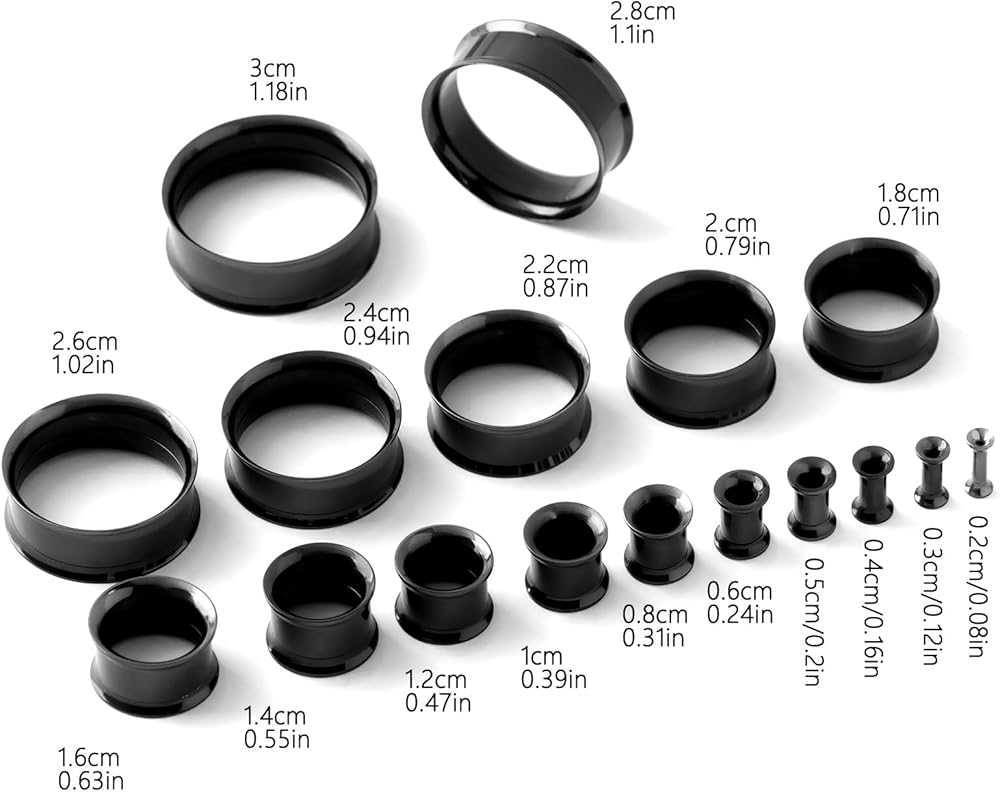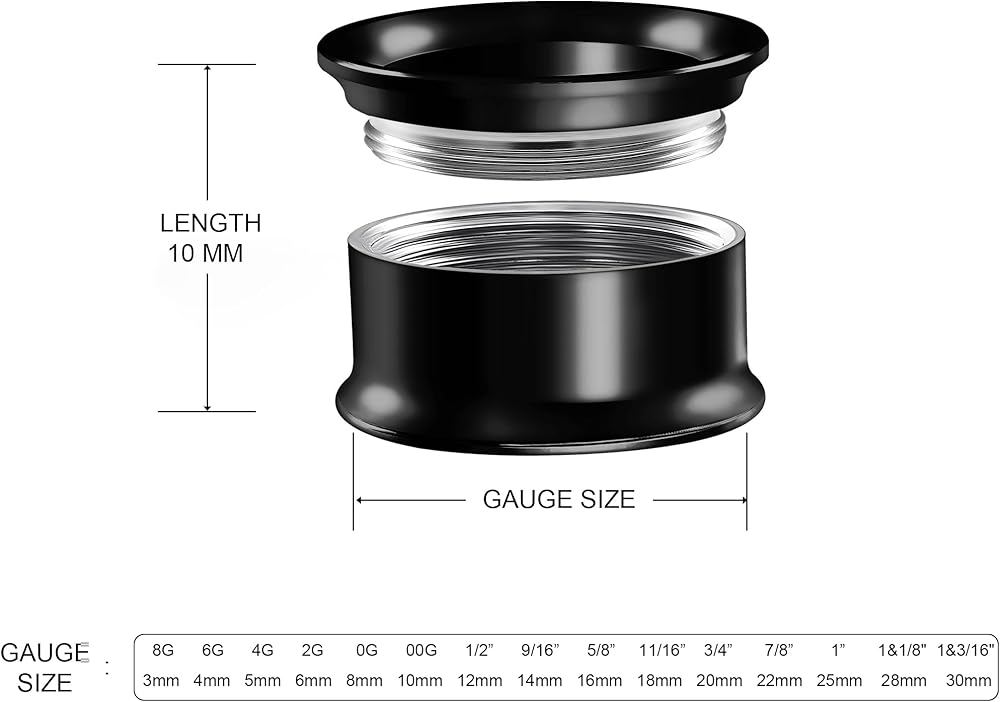 • الحجم: 8 جرام (3 ملم)، 6 جرام (4 ملم)، 4 جرام (5 ملم)، 2 جرام (6 ملم)، 0 جرام (8 ملم)، 00 جرام (10 ملم)، 1/2 بوصة (12 ملم)، 9/16 بوصة (14 ملم)، 5/ 8 بوصة (16 ملم)، 11/16 بوصة (18 ملم)، 3/4 بوصة (20 ملم)، 7/8 بوصة (22 ملم)، 1 بوصة (25 ملم)، 1&1/8 بوصة (28 ملم)، 1&3/16 بوصة (30 ملم). مقاسات مختلفة يمكن أن تلبي متطلبات تكبير أذنك أو ثقبها