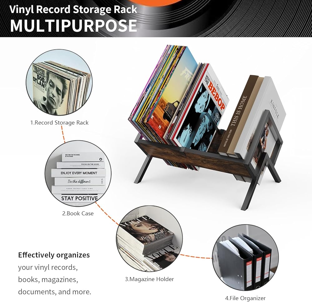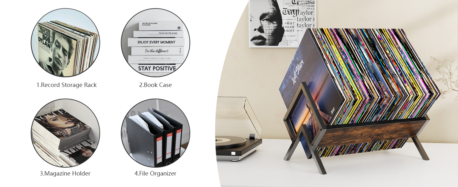 【وظائف متعددة الأغراض】: بالإضافة إلى تنظيم السجلات، يمكن استخدام هذا المنتج كحامل عرض لكتبك ومجلاتك وأعمالك الفنية المحبوبة. إنه بمثابة حل تخزين للسجلات وعرض مذهل للفن، مما يعزز نمط وجمال منزلك.
