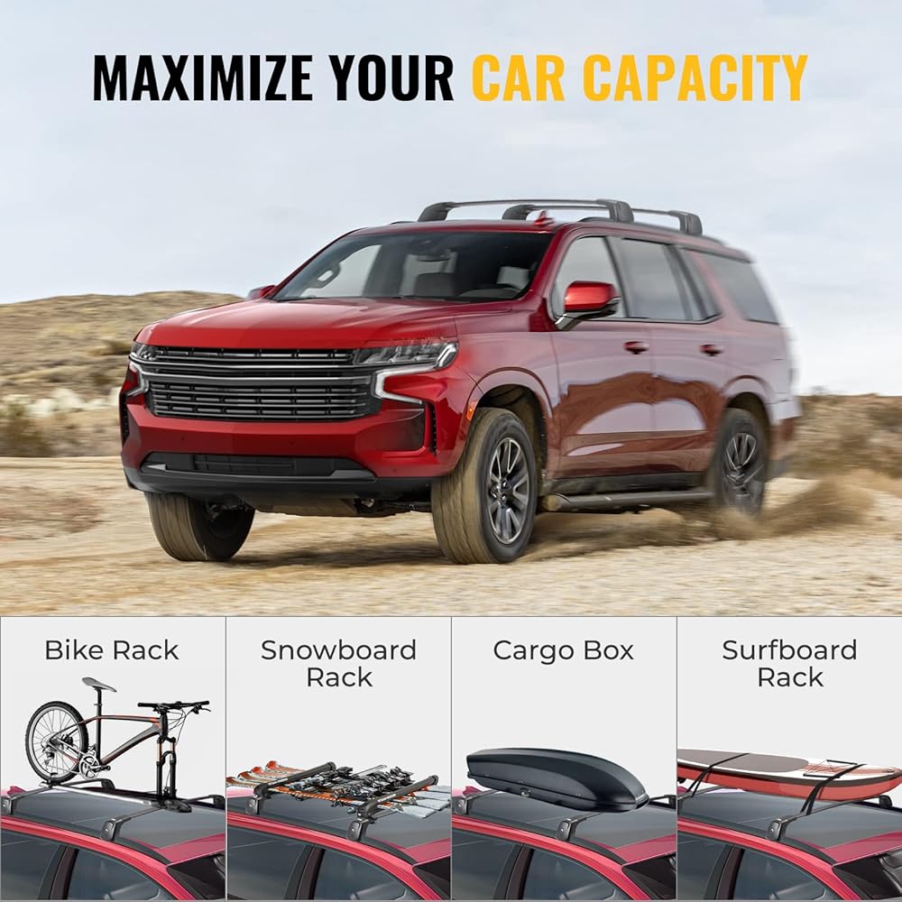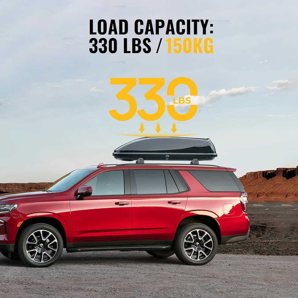قم بزيادة سعة سيارتك: تم تصنيف رف سقف السيارة BougeRV ليحمل 150 كجم /330 رطلاً. مثالية لنقل العناصر التي لا تناسب سيارتك مثل أكياس السقف، وصناديق السقف، وحاملات الدراجات، وألواح ركوب الأمواج، وزوارق الكاياك، والزوارق، والسلع الرياضية، والسلالم، والأمتعة، وأكثر من ذلك بكثير الذي تريده.