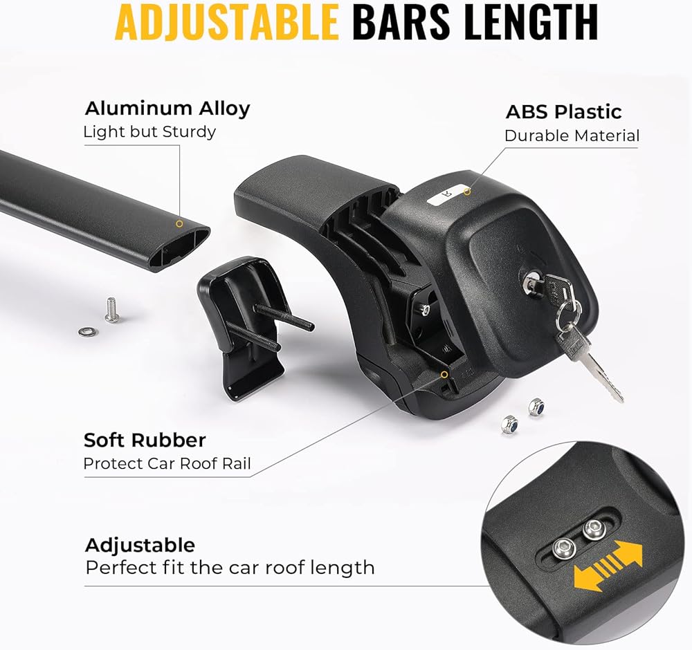تجلب لك الأمان والمتانة: تمت ترقية القضبان المتقاطعة لحامل السقف من BougeRV بميزة القفل للأمان وهي مصنوعة من الألومنيوم عالي الجودة، وأقدام القاعدة مصنوعة من البلاستيك عالي الجودة. الألومنيوم أخف بنسبة 30% في المتوسط من الفولاذ. يمكن لقضبان السقف المتقاطعة أن تتحمل ضغوطًا أكبر من أفضل رفوف السقف المصنوعة من الفولاذ بالكامل بوزن أقل بنسبة 1/3.