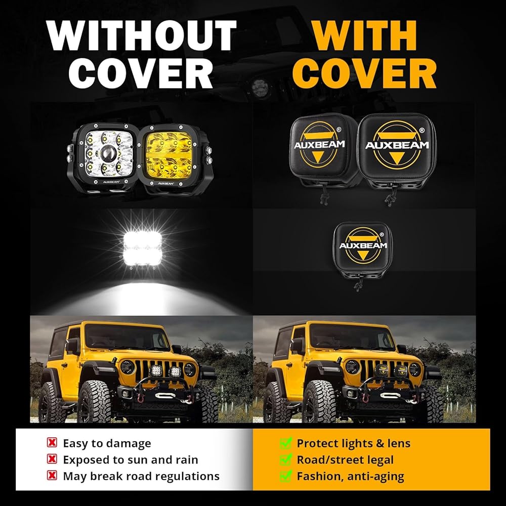 رائع وقانوني - استخدم أغطية الإضاءة Auxbeam مقاس 5 بوصات لإضافة مظهر أنيق ومخصص لسيارتك وتوفير حماية إضافية من الخدوش والصخور والحطام والضباب والغبار والمطر والثلج والظروف الجوية القاسية. تأكد أيضًا من بقاء الأضواء قانونية مع قواعد الطريق وبعض لوائح الدولة.