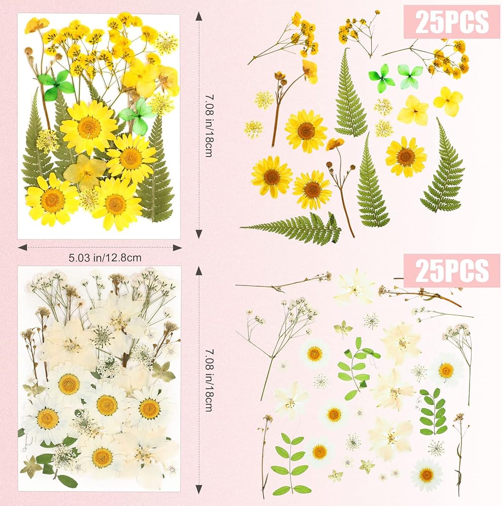 • Satisfy Your Daily Use: you will receive 4 different types of pressed flowers for crafts, respectively are white daisies, yellow daisies, red daisies, rose red daisies, each theme has 25 pieces of flower materials and leaves, the quantity is enough to meet your daily matching and replacement needs