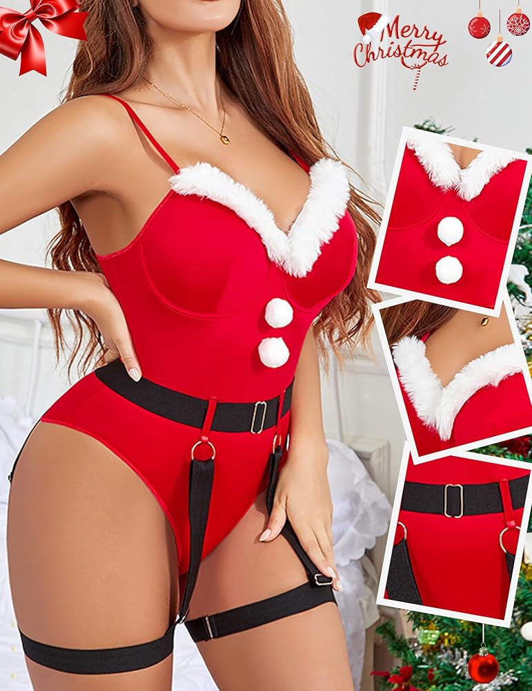 - Package contents: 1 piece of female sexy Christmas teddy, 1 piece of black belt, 2 pieces of thigh rings.