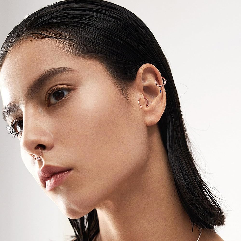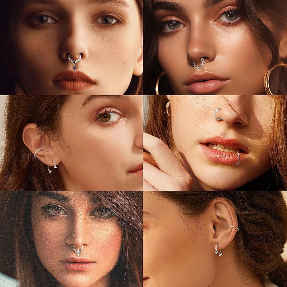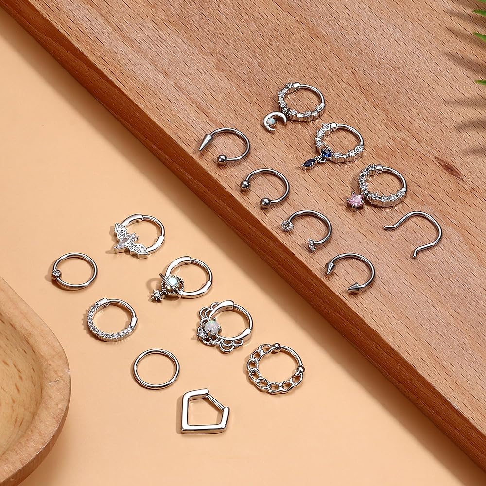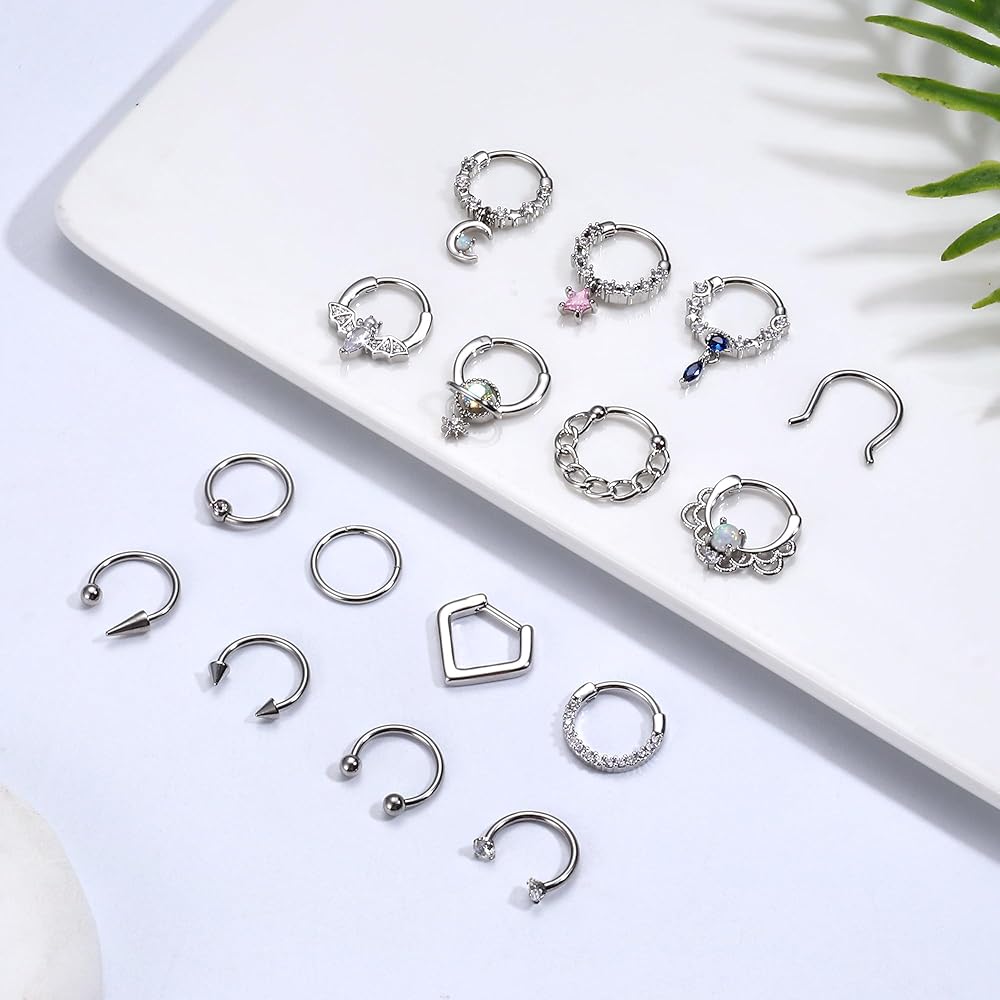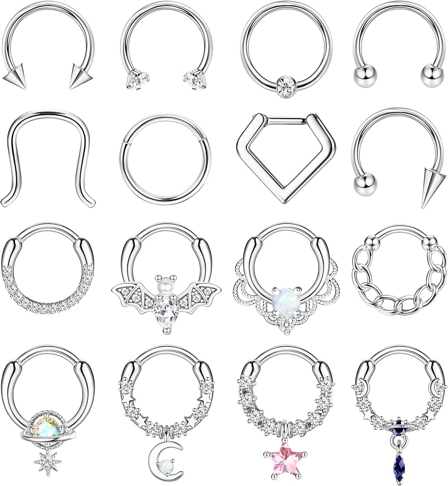 مجموعة متنوعة من الأنماط: تأتي حلقات الحاجز 16G لدينا بتصميمات مختلفة، بدءًا من البسيطة والأنيقة إلى الجريئة والمثيرة، بما في ذلك 4 حلقات أنف متدلية، و4 مجوهرات حاجزة لطيفة، و5 حلقات حاجز على شكل حدوة حصان، و2 نقرة بسيطة على شكل حاجز، وحلقة خرز أسيرة. متوفر بأربعة ألوان: فضي، ذهبي، أسود، وردي ذهبي. مجموعة متنوعة من الأنماط والألوان لتناسب ملابسك اليومية