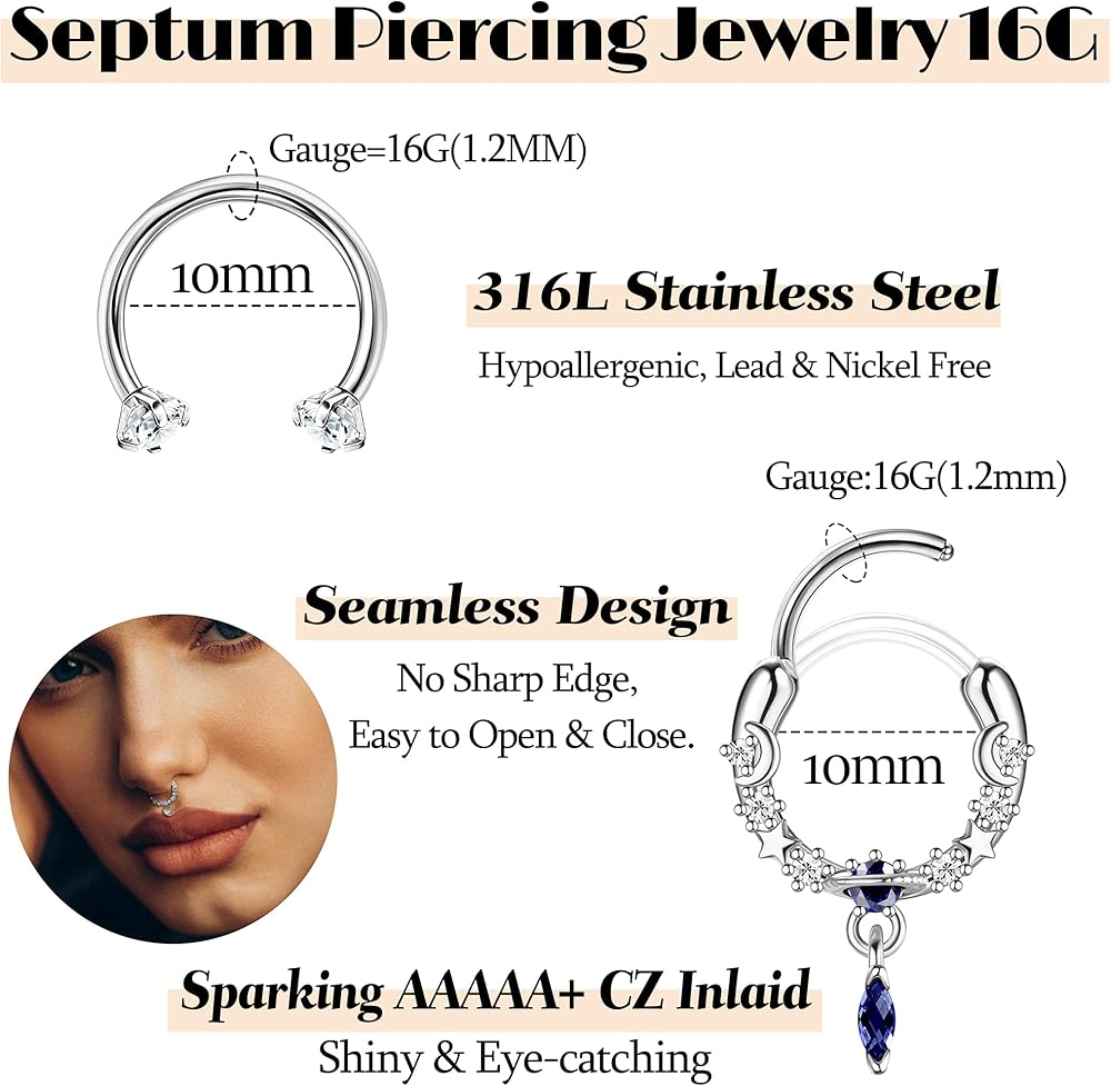الحجم والاستخدام: المقياس: 16 جرام = 1.2 مللي متر. القطر الداخلي: 10 مم (3/8 بوصة). يمكن استخدام حلقات الحاجز الصغيرة هذه كمجوهرات حاجز، وثقب للأنف، وأقراط دايث، وحلقات شفاه، ومجوهرات ثقب الزنمة، وأطواق حلزونية، وأقراط غضروفية، وأطواق محارة، وثقب الأذن وغيرها من ثقب الجسم. المجوهرات يمكنك تجربة مجموعة متنوعة من المجموعات حسب تفضيلاتك