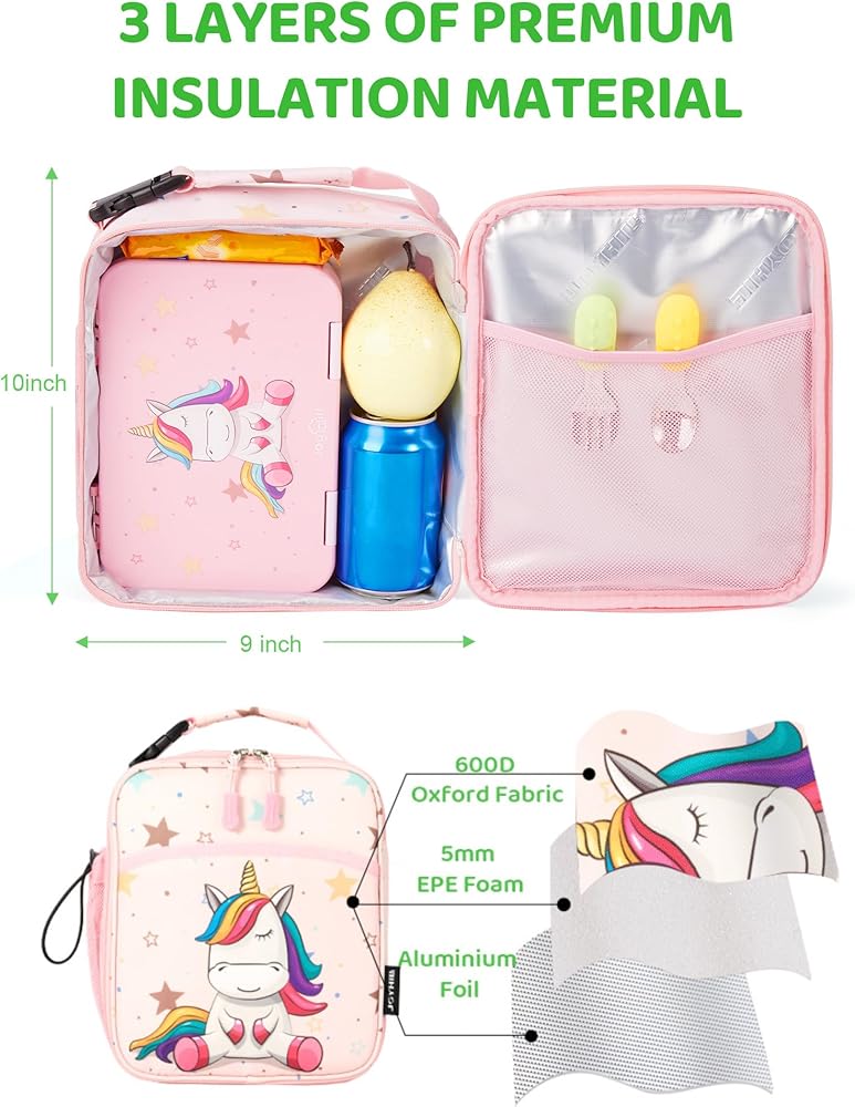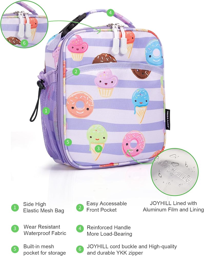 السعة والوظيفة المناسبة: سعة حقيبة الغداء اللطيفة للأطفال من JOYHILL هي 9 بوصة طول × 4 بوصة عرض × 10 بوصة ارتفاع، مع فتحة كبيرة، كافية لاستيعاب صندوق غداء كبير للأطفال وبعض الفواكه، سهلة الجلب. حقيبة غداء مدرسية مثالية للمراهقين لحمل وجبات الغداء