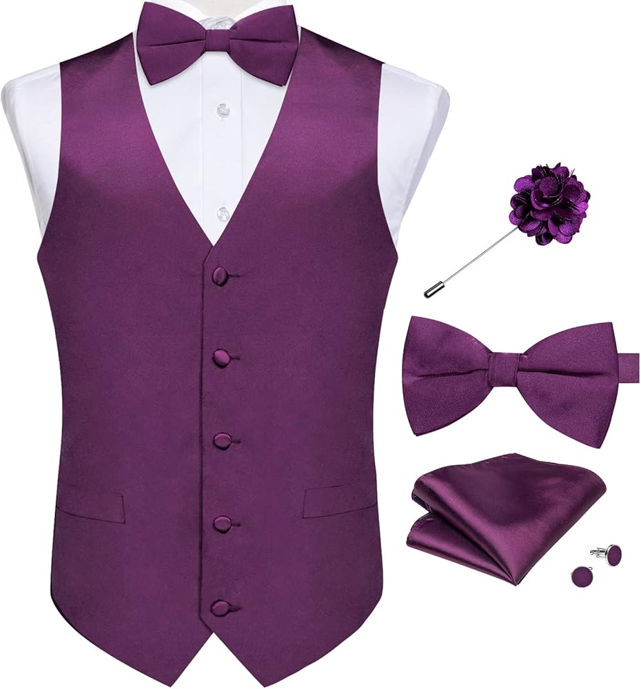 【يحتوي الشراء على صدرية بدلة من الساتان الأرجواني + ربطة عنق مربوطة مسبقًا + دبوس طية صدر السترة. ليس فقط للاستخدام الشخصي، ولكن أيضًا هدايا ممتازة لأحبائك في العطلات مثل عيد الميلاد، وعيد الحب، وعيد الشكر، وعيد الأب، ورأس السنة الجديدة، والذكرى السنوية، عيد ميلاد إلخ