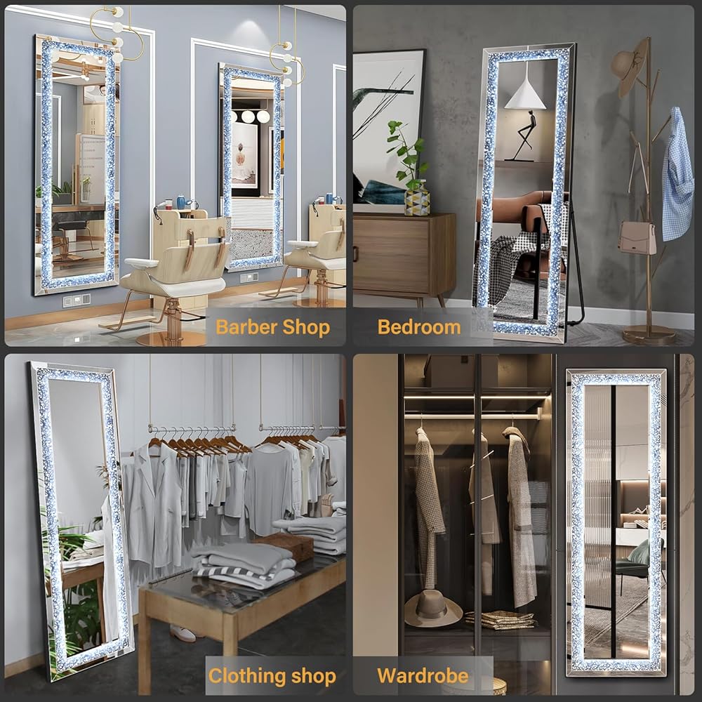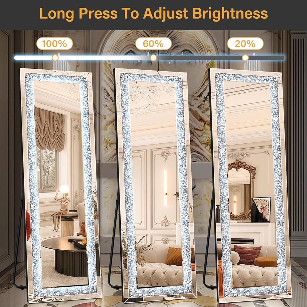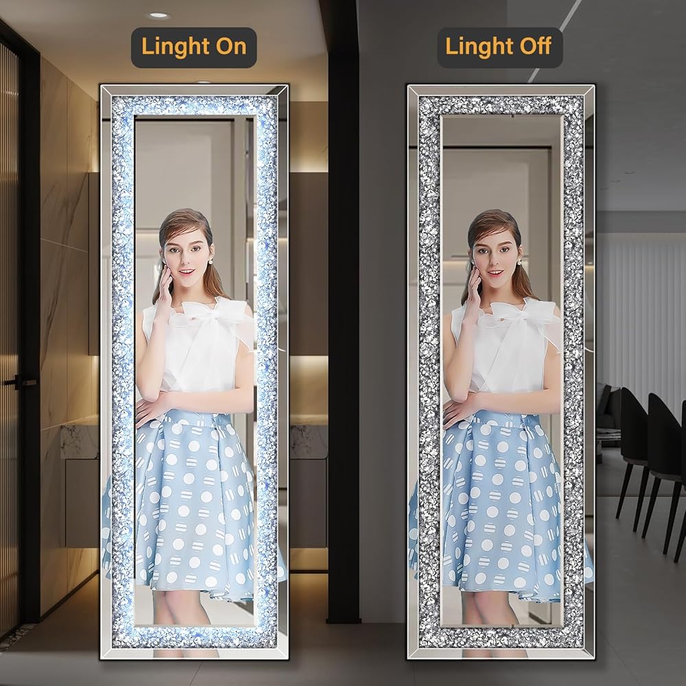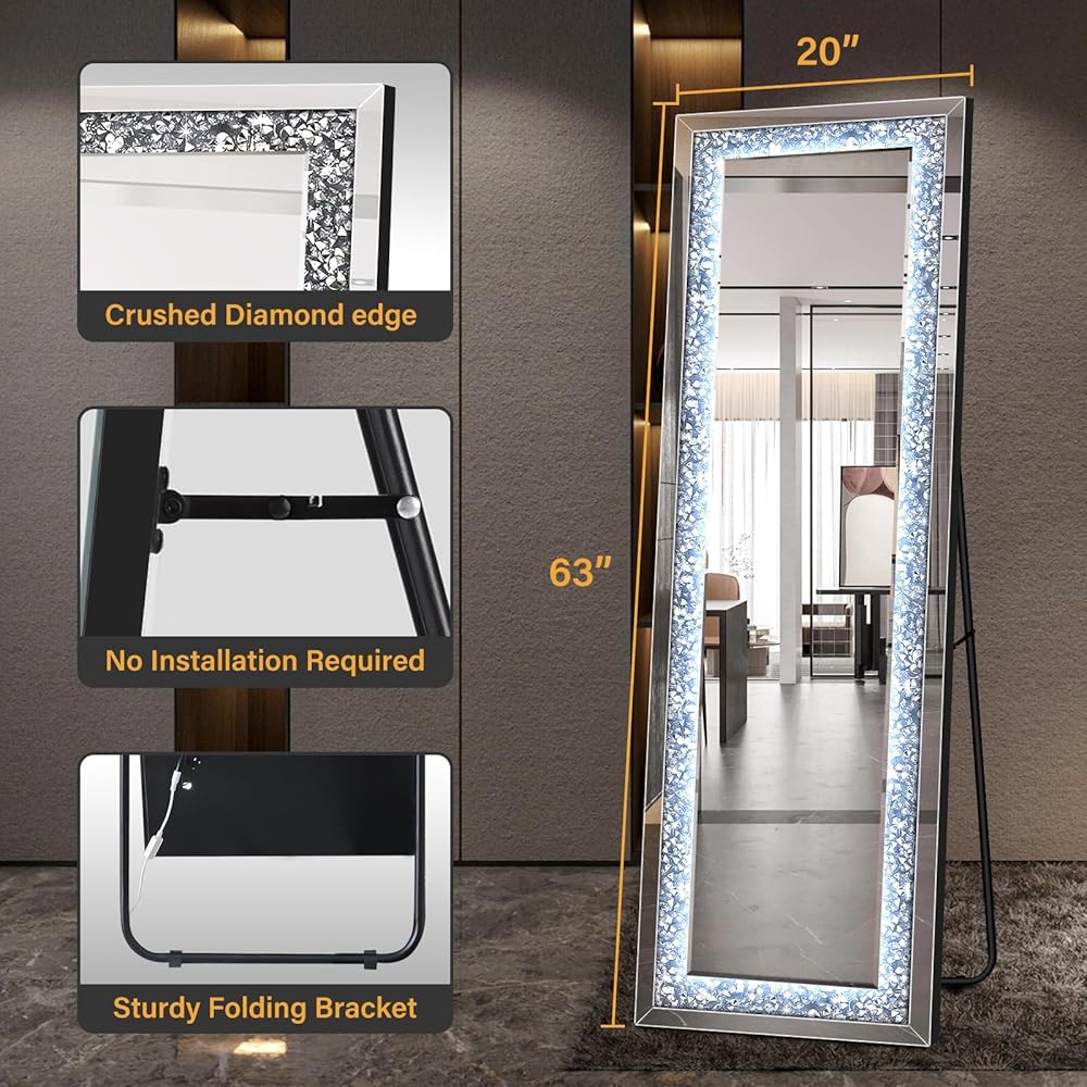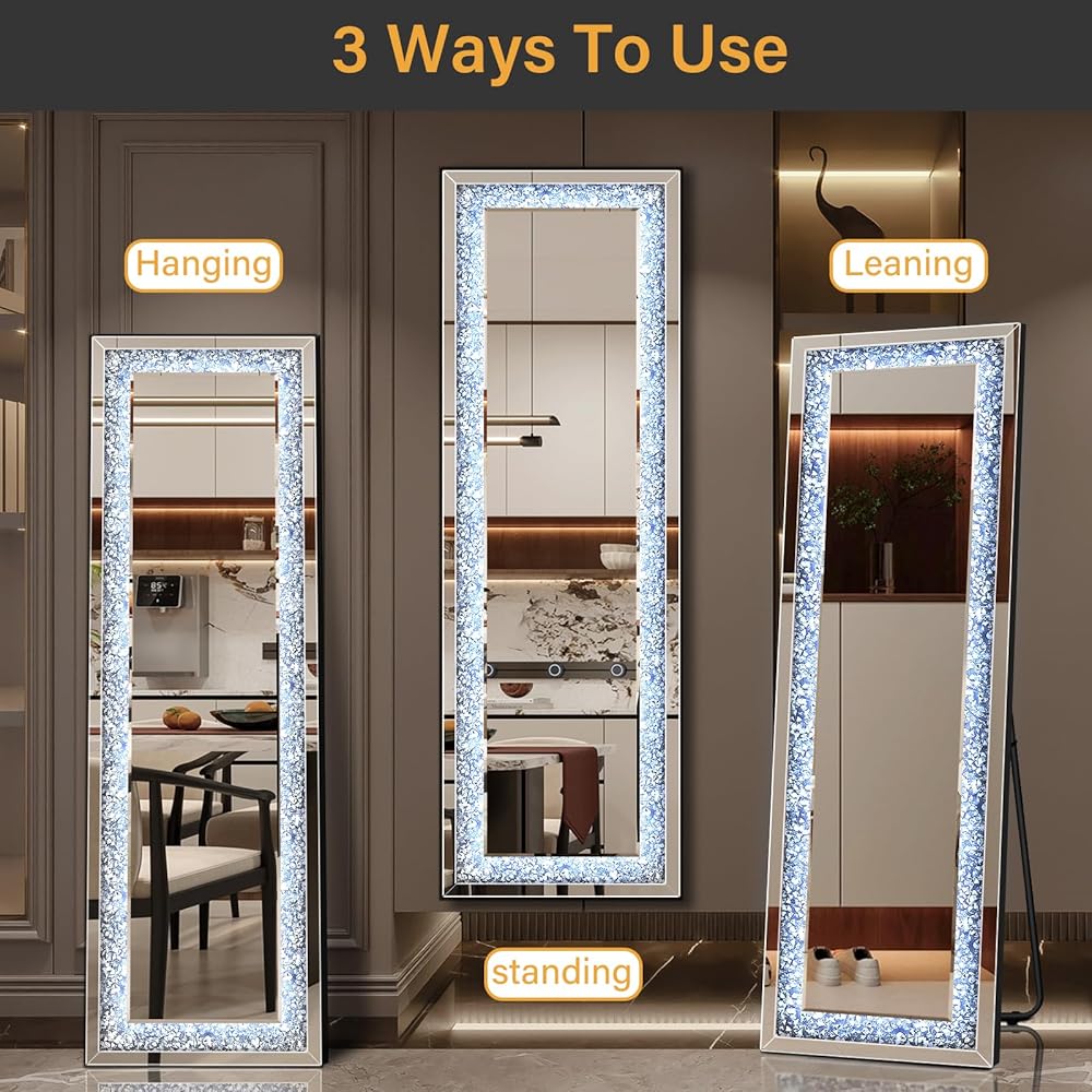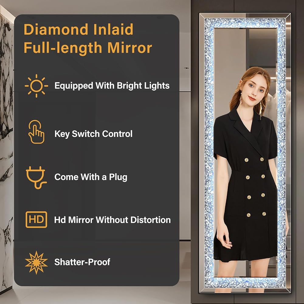 【حافة ماسية مسحوقة】مرآة واقفة بطول كامل، مرصعة بالألماس الشفاف المطحون، تضيف الرقي إلى أي مساحة. على عكس المرايا الأخرى ذات الطول الكامل، تضمن مرآة الأرضية المرصعة بالألماس ذات الطول الكامل أناقة خالدة
