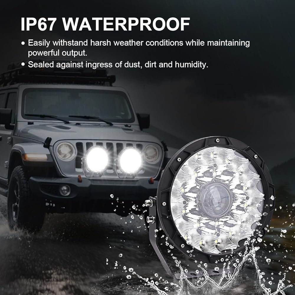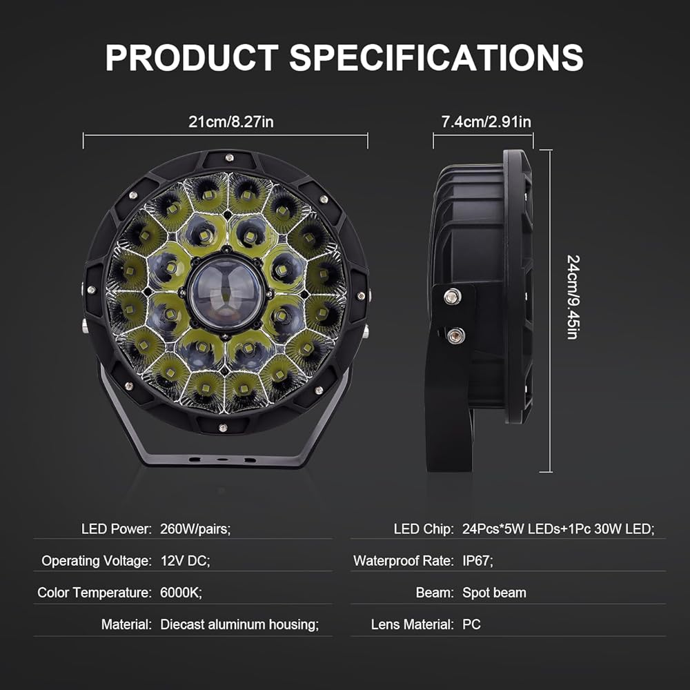 مواصفات المنتج: بوصة: 9 بوصات طاقة LED: 408 وات الجهد المطبق: تيار مستمر 10-30 فولت (يناسب 12 فولت / 24 فولت) عمر LED: أكثر من 50000 ساعة لومن: 40800 لومن درجة حرارة اللون: 3200 كلفن لون ضوء LED: لون أصفر معيار مقاوم للماء: IP67