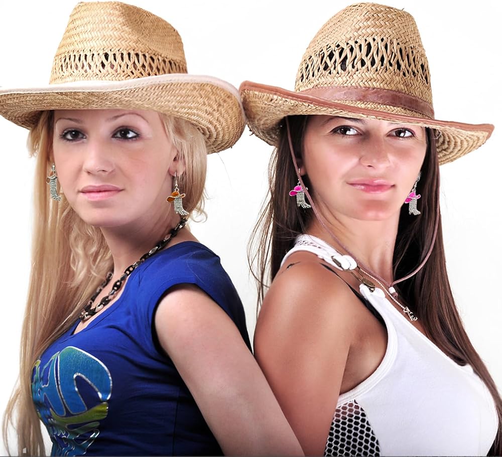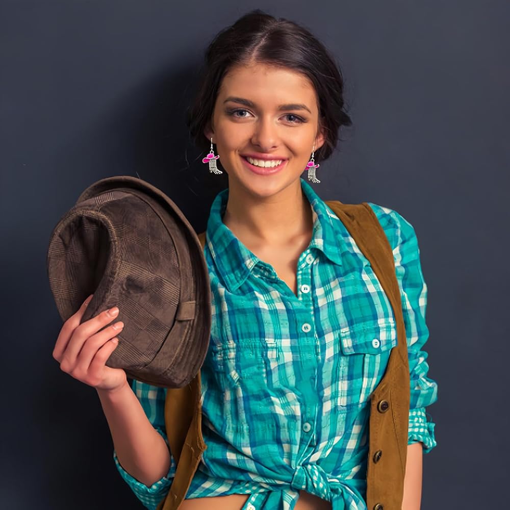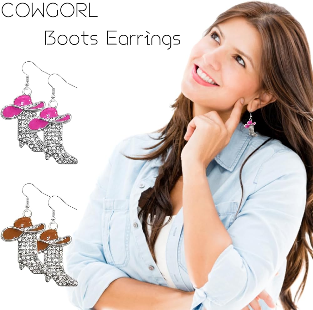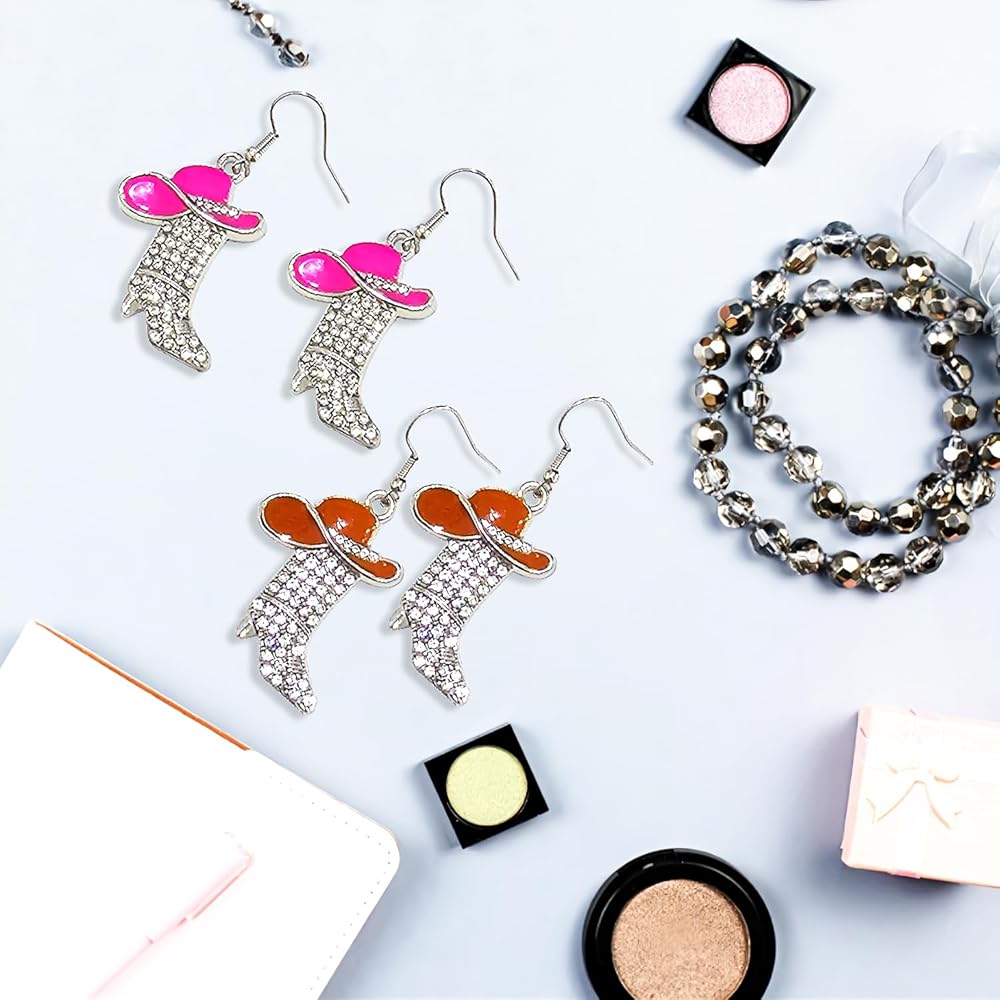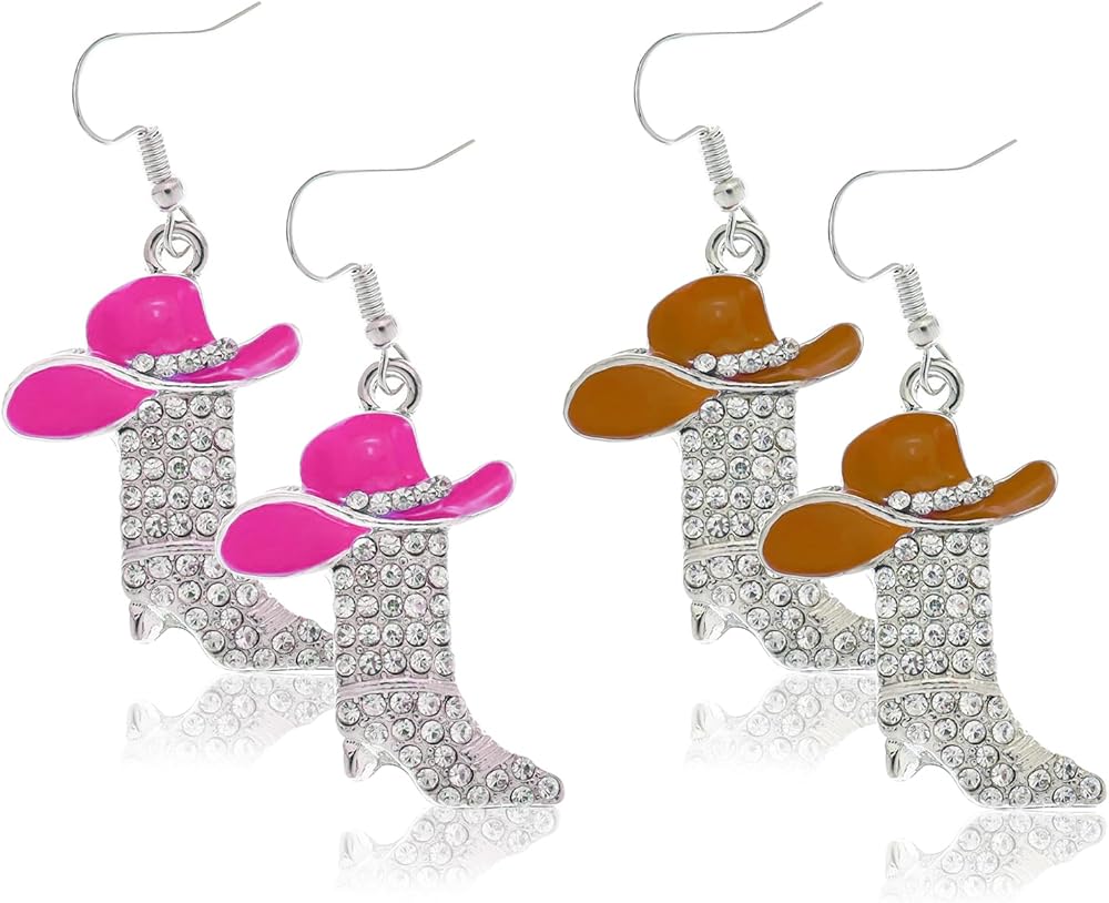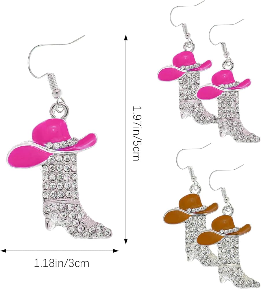 مجموعة الأقراط الغربية: زوج واحد من قبعة رعاة البقر من حجر الراين الأحمر الوردي وأقراط أحذية رعاة البقر، زوج واحد من قبعة رعاة البقر من حجر الراين البني وأقراط أحذية رعاة البقر، لامعة ومناسبة لموضوع رعاة البقر الغربي