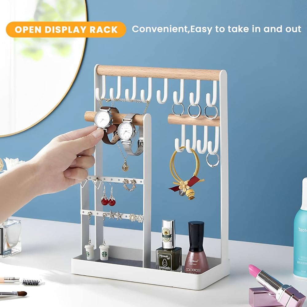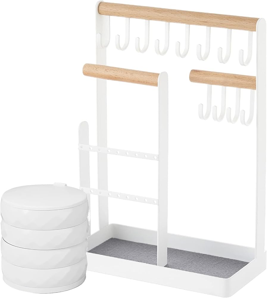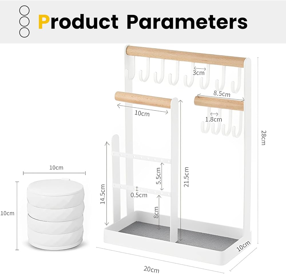 مساحة تخزين واسعة - يتميز منظم المجوهرات هذا برف برجي خشبي من 6 طبقات وعلبة صينية مجوهرات دوارة من 4 طبقات مع مرآة، مما يوفر مساحة كبيرة لتخزين وعرض الأساور والساعات والأقراط والخواتم والقلائد. كما أنها تحتوي على 12 خطافًا لتعليق مجوهراتك، مما يجعلها خالية من التشابك ويمكن الوصول إليها بسهولة. حامل منظم مجوهرات مثالي لجميع احتياجات تخزين المجوهرات الخاصة بك.