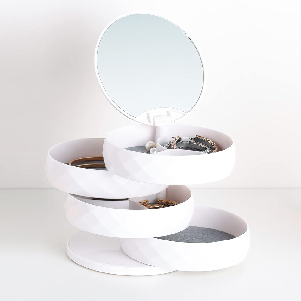 متعددة الاستخدامات وواسعة - تسمح الصينية الدوارة المزودة بمرآة بسهولة رؤية واختيار قطع المجوهرات الخاصة بك، مما يضيف الراحة والعملية إلى روتين تنظيم المجوهرات الخاص بك. إنها حقيبة رائعة لتخزين مجوهرات السفر للنساء وحتى الرجال، مما يسمح لك بإحضار مجوهراتك المفضلة معك أينما ذهبت.