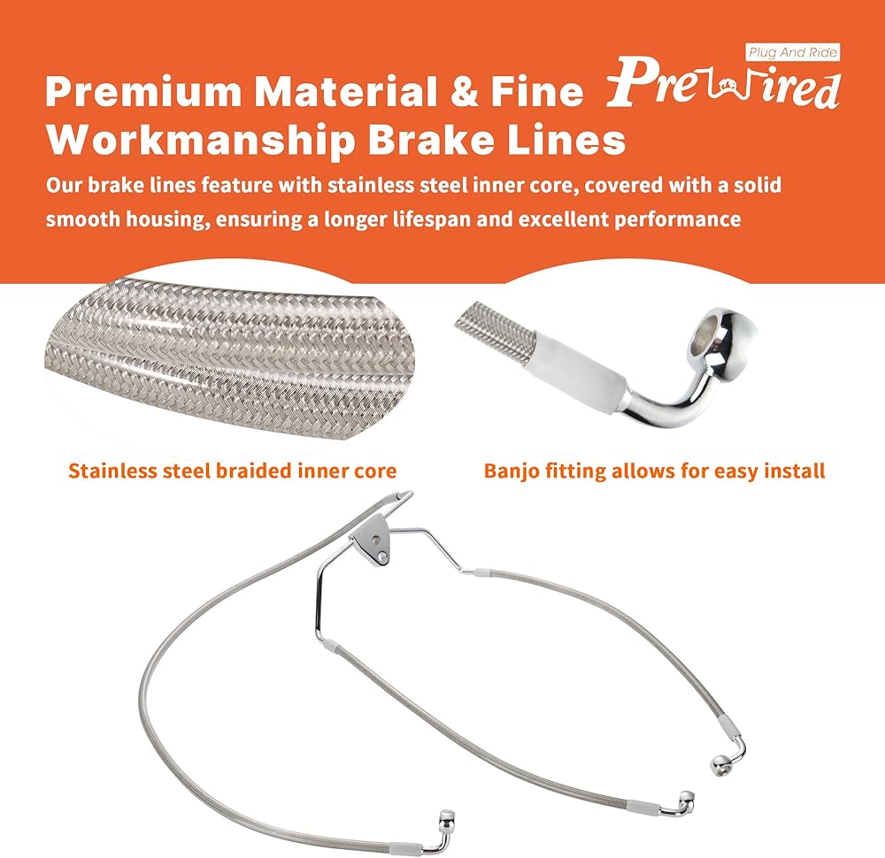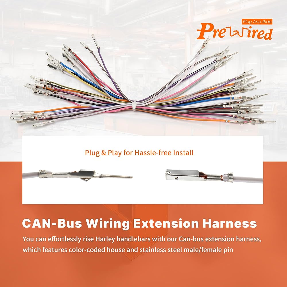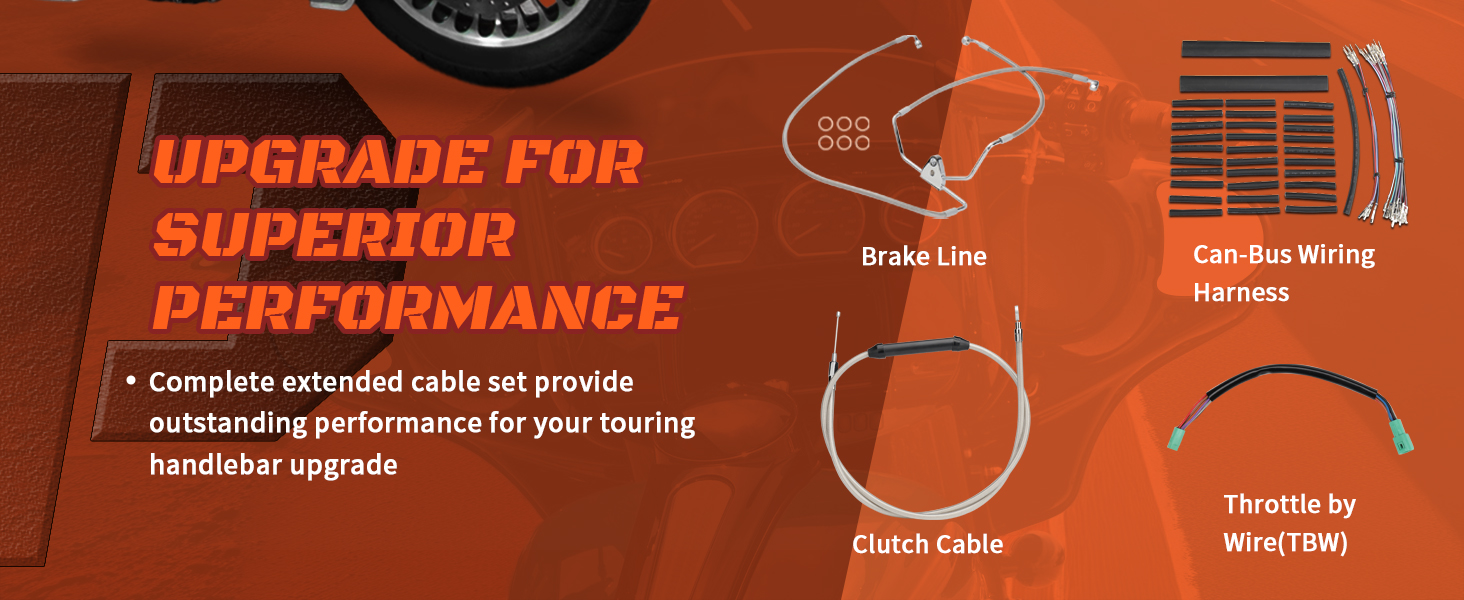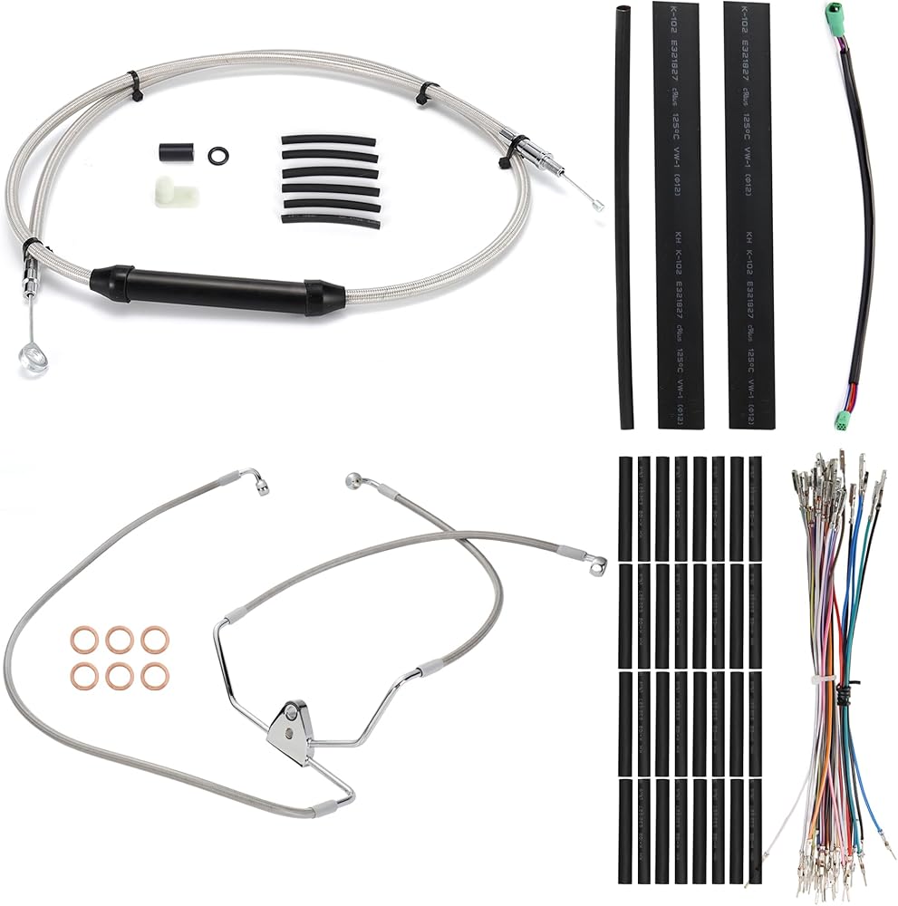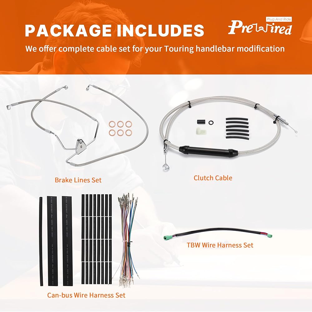 • مجموعة تمديد الكابلات الكاملة - تتضمن الحزمة 1 X خط الفرامل، 1 X كابل القابض، 1 X مجموعة TBW، 1 X مجموعة أسلاك Can-Bus وأنابيب قابلة للانكماش بالحرارة. مجموعة تمديد سلكية احترافية مصممة لتعديل مقود Harley Touring بدون ABS