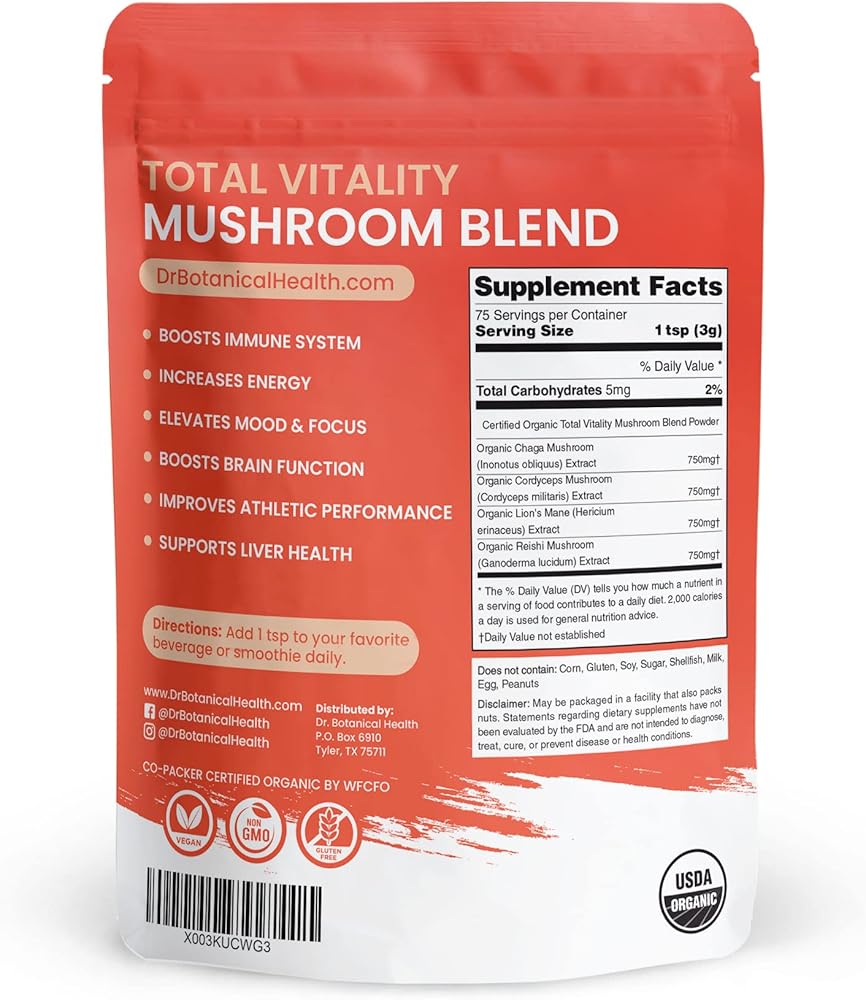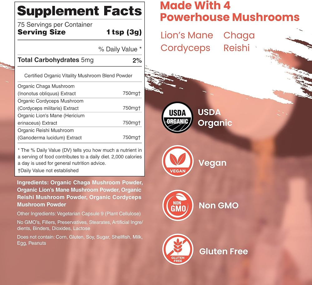 نحن نرتقي - صحتك هي مهمتنا. مسحوق مزيج الفطر الأربعة الخاص بنا معتمد من وزارة الزراعة الأمريكية ولا يحتوي على مواد مالئة أو مواد حافظة أو أصباغ. جميع منتجاتنا غير معدلة وراثيًا، ونباتية، وخالية من الغلوتين.