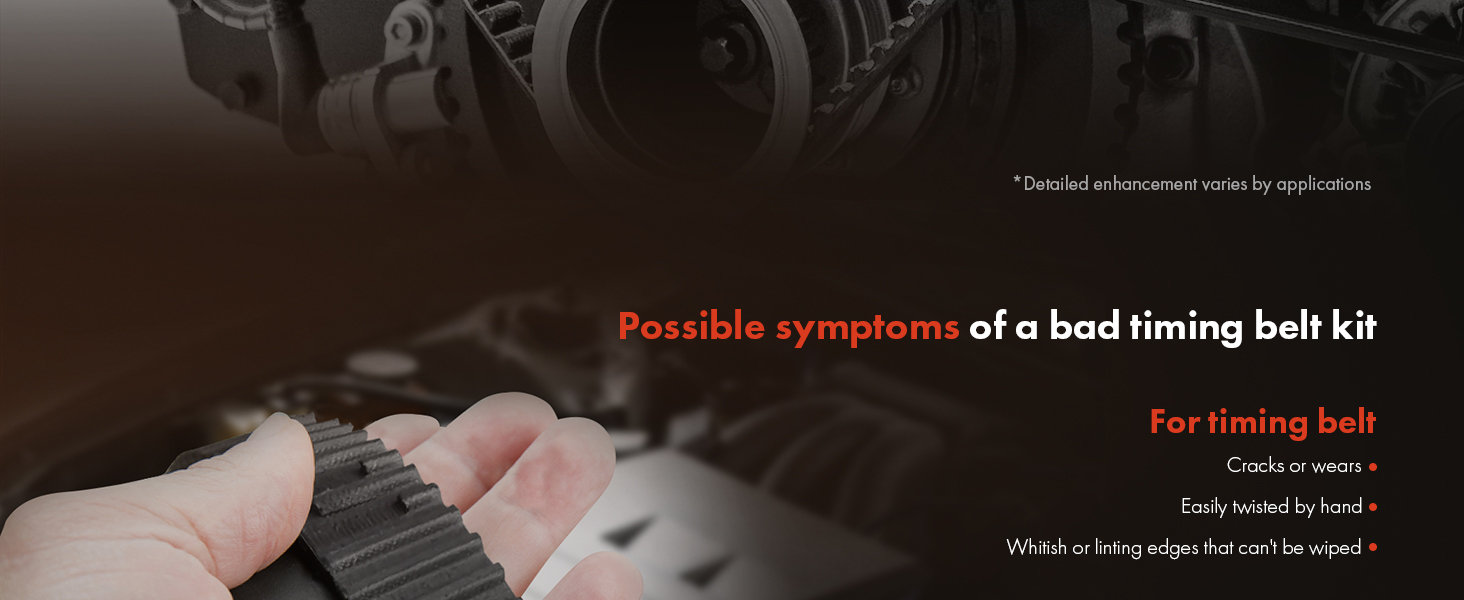 [الوظائف]: عادةً ما توجد مجموعة حزام التوقيت (أو الكامة) الممتازة مع مضخة مياه في مقدمة المحرك وتلتف حول مجموعة من العجلة المسننة. فهو يضمن الاتصال بين عمود الكامات والعمود المرفقي، مما يجعل المكابس والصمامات تعمل معًا بالتسلسل الصحيح. وسوف يساعد المحرك على العمل بشكل طبيعي، وتحسين كفاءة استهلاك الوقود، وبالتالي تحسين أداء المحرك بشكل فعال.