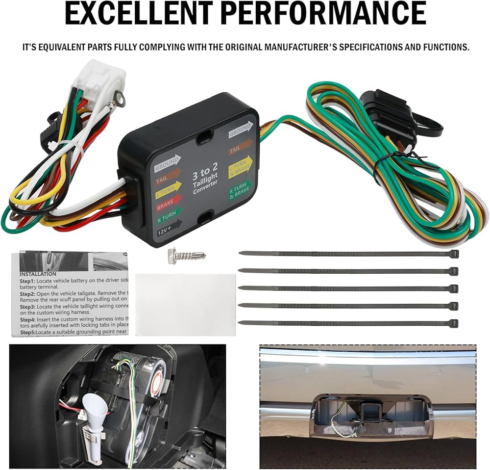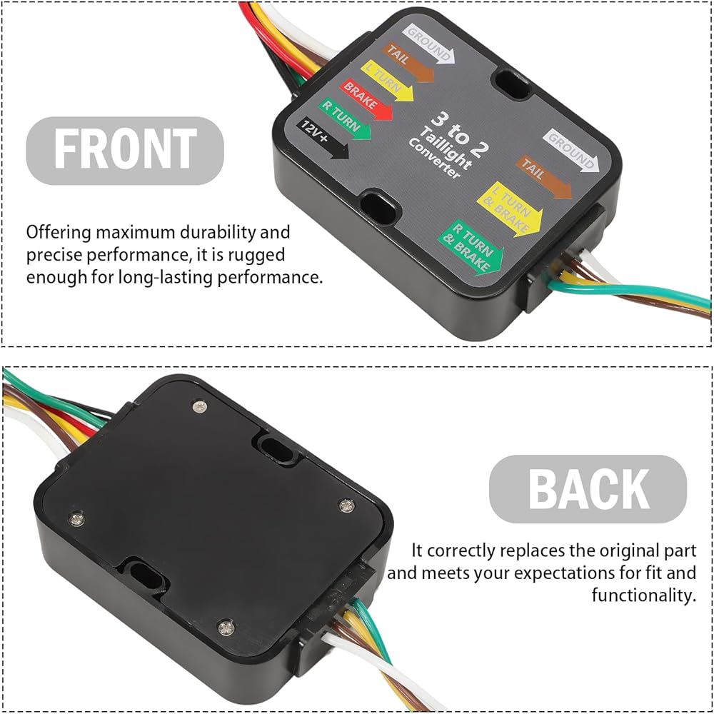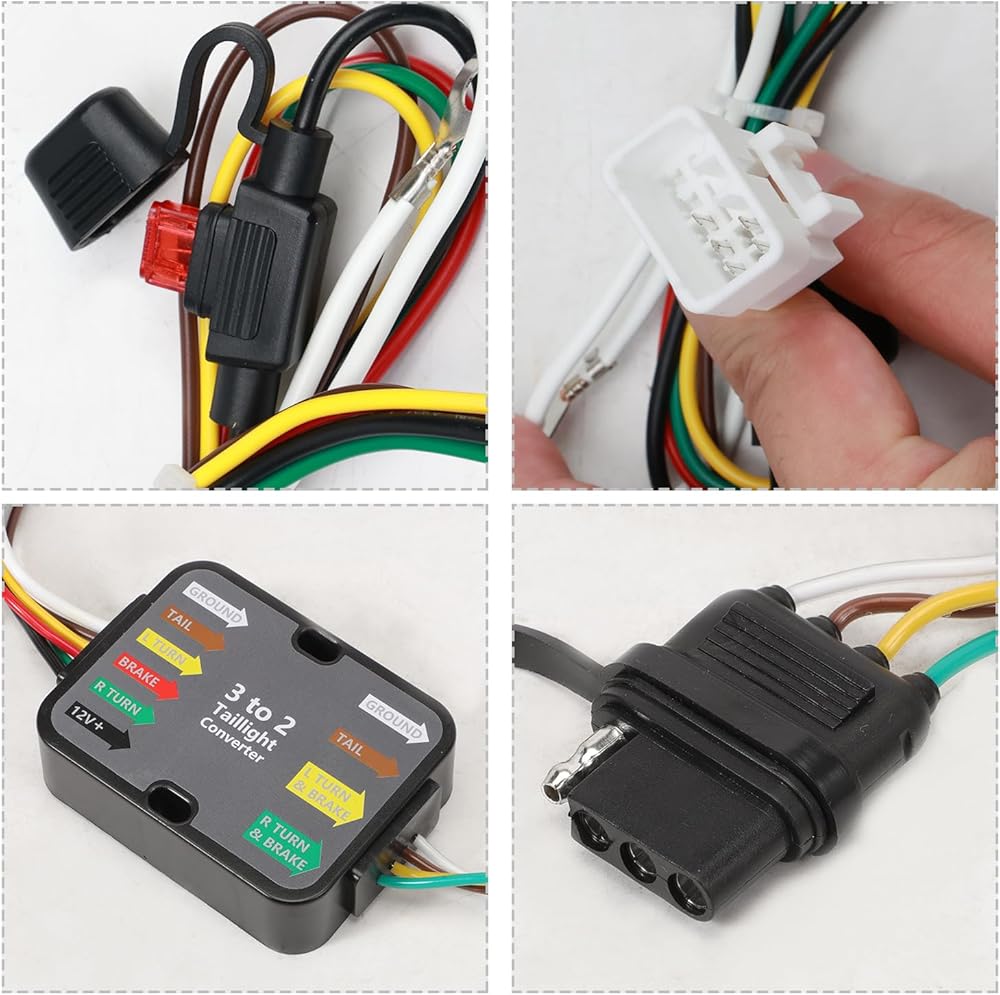 Function: 4-way flat output trailer wiring harness can connect tail lights, brake lights and turn signals, equipped with tail light converter, compatible with vehicle trailer; allowing you to have a safe and reliable towing experience