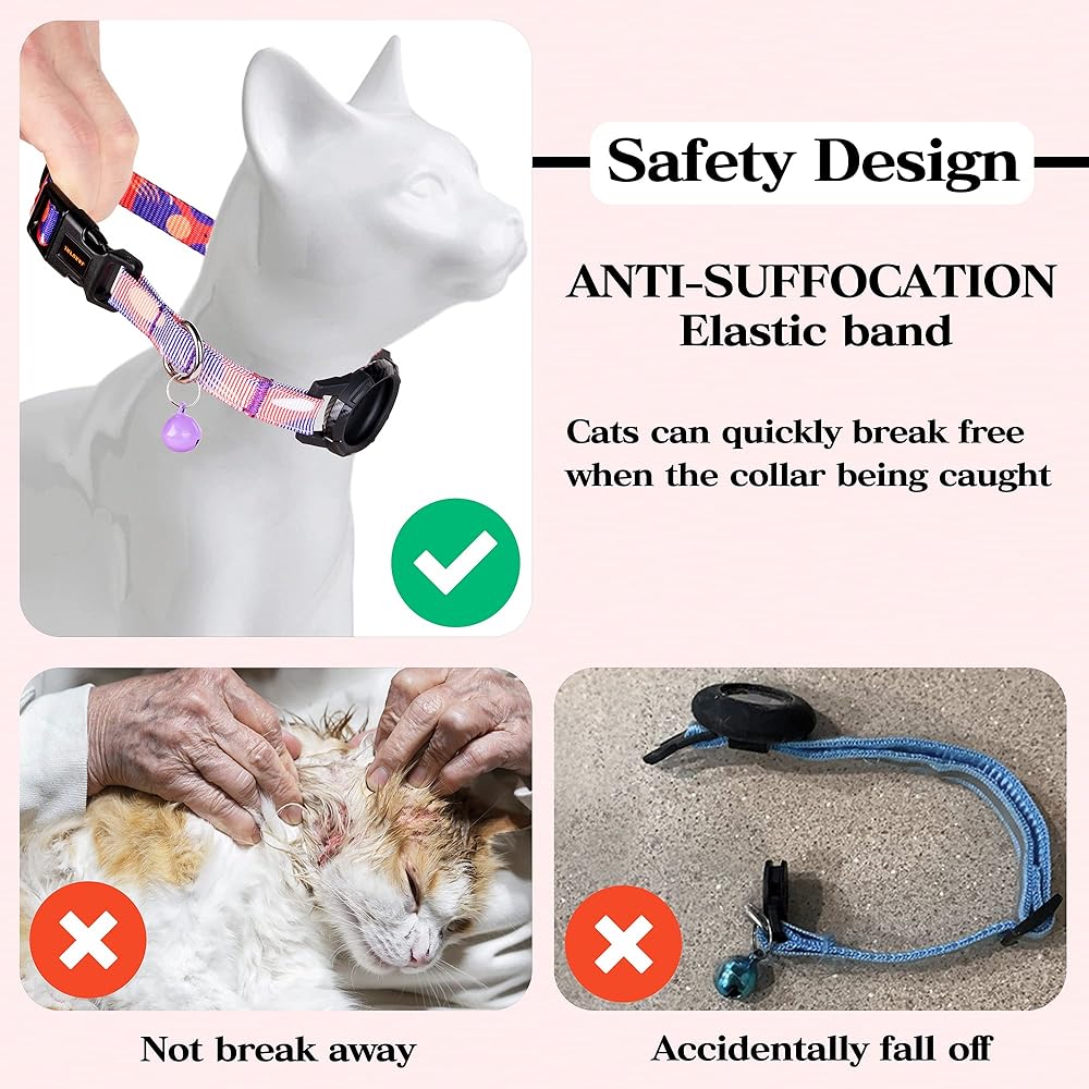 • 【طوق آمن قابل للتمدد】مع شريط مطاطي طويل، فهو قابل للتمدد بما يكفي للسماح للقطة بسحب رأسها للخارج إذا علقت دون القلق بشأن ميزة الانفصال التي تسبب سقوطها عن طريق الخطأ. يساعد في الحفاظ على سلامة القطط ويمنعها من الضياع.