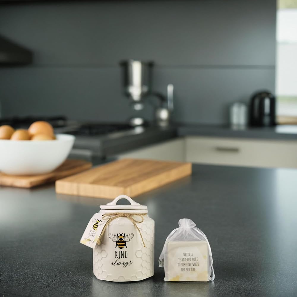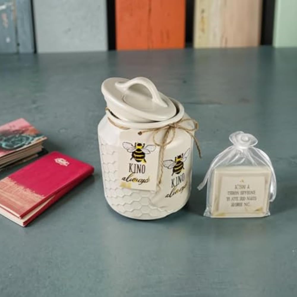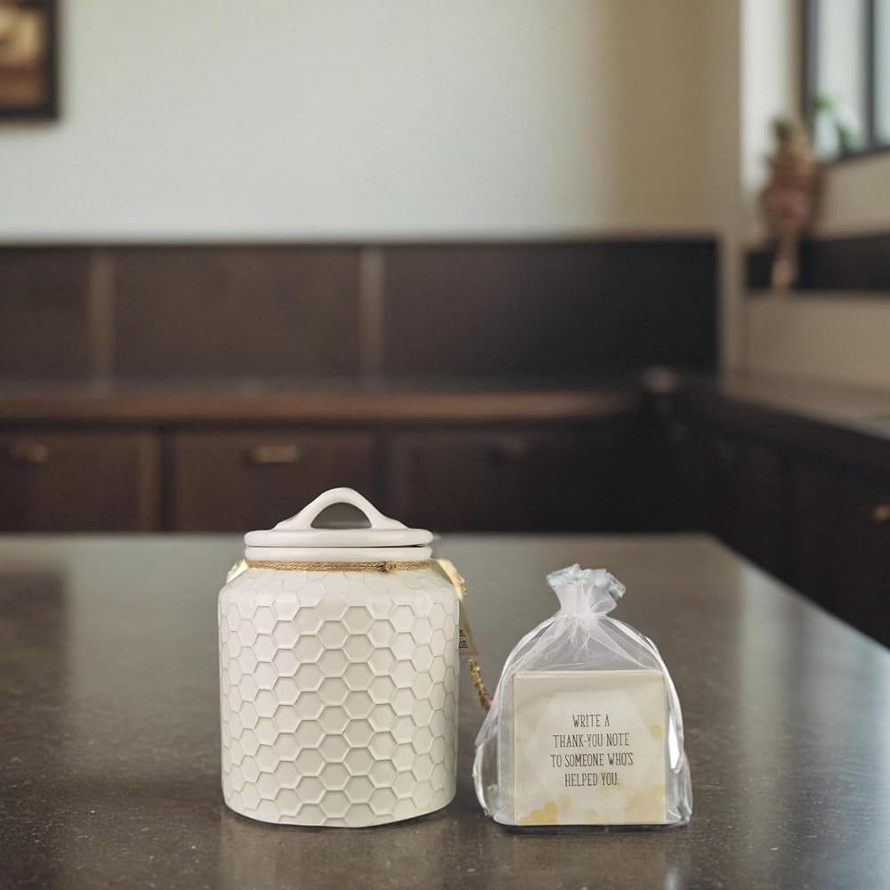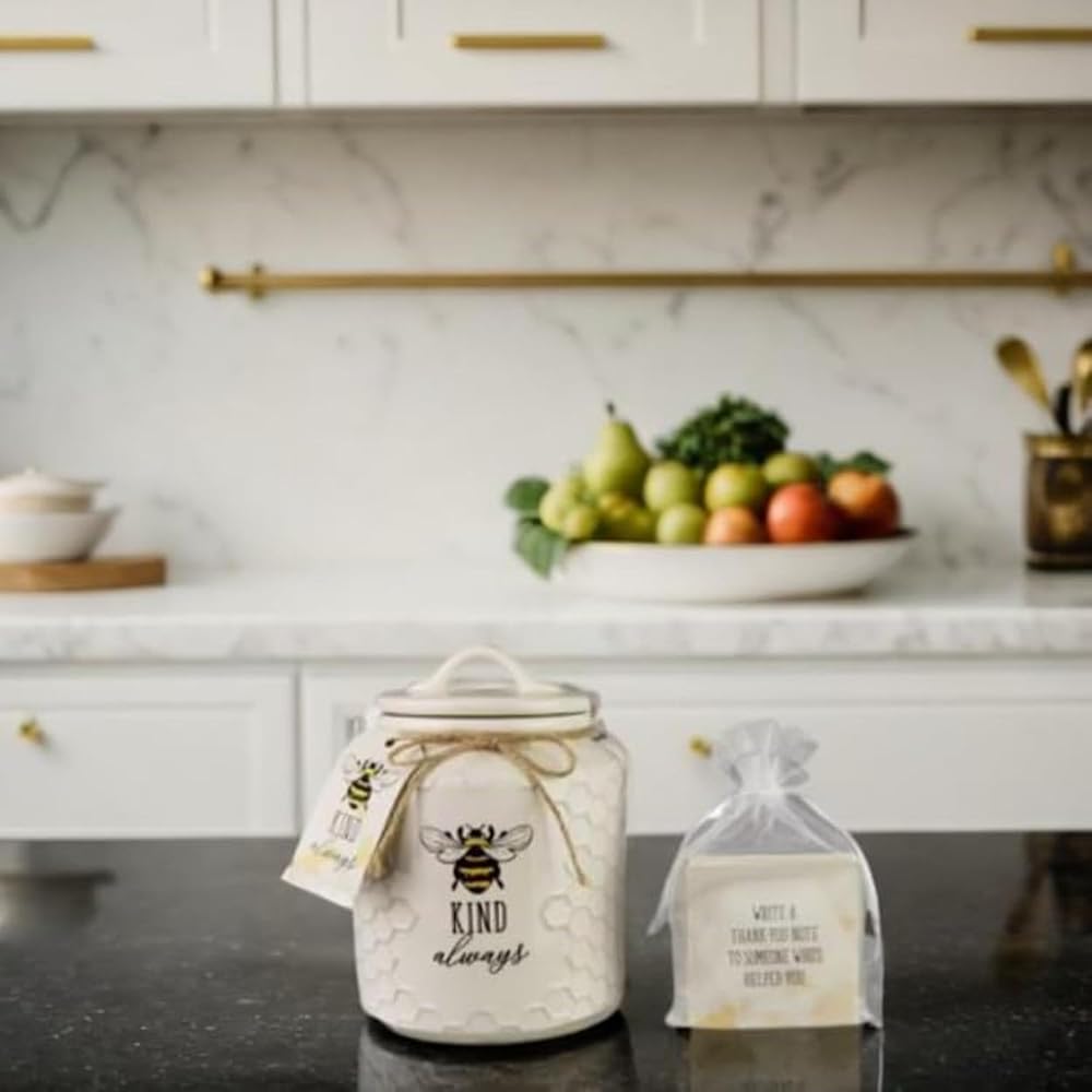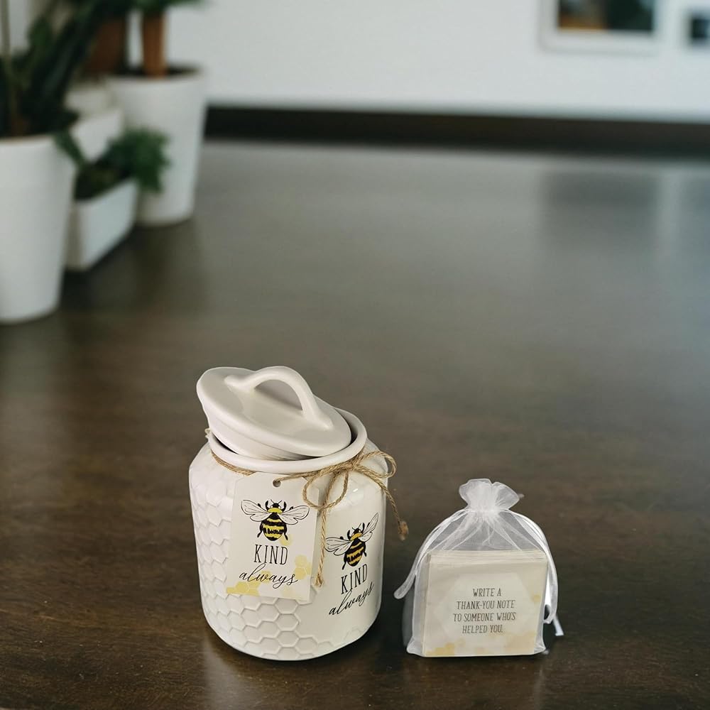 احتضن الإيجابية مع برطمان الفرح - اختر بطاقة واحدة كل يوم واملأ يومك بالبهجة. الجرة المزخرفة لدينا مصنوعة من مادة السيراميك المتينة مع نحلة جذابة في المنتصف وهيكل قرص العسل مطبوع في كل مكان. يعد النص الموجود على الجرة بمثابة تذكير بأن تكون لطيفًا دائمًا