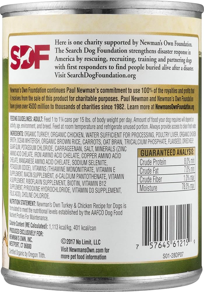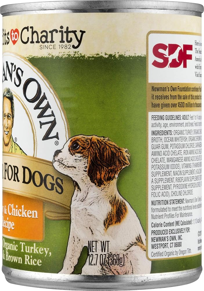 Newman's Own Dinners for Dogs are made with over 70% organic ingredients and provide complete and balanced nutrition for dogs of all life stages. All recipes feature organic beef or poultry as the first ingredient and, of course, have no wheat, corn or artificial colors or flavors. Newman's Own, Inc., founded by Paul Newman in 1982, offers great tasting, high quality food and beverage products for people and pets. Products include salad dressings, pasta sauces, frozen pizza, salsa, refrigerated drinks, cookies, barbecue sauce and snacks as well as dog food, cat food and pet treats. Newman's Own Foundation continues Paul Newman's commitment to use 100% of royalties and profits that it receives from the sale of its food products for charitable purposes. Over $500 million has been given to thousands of charities since 1982.