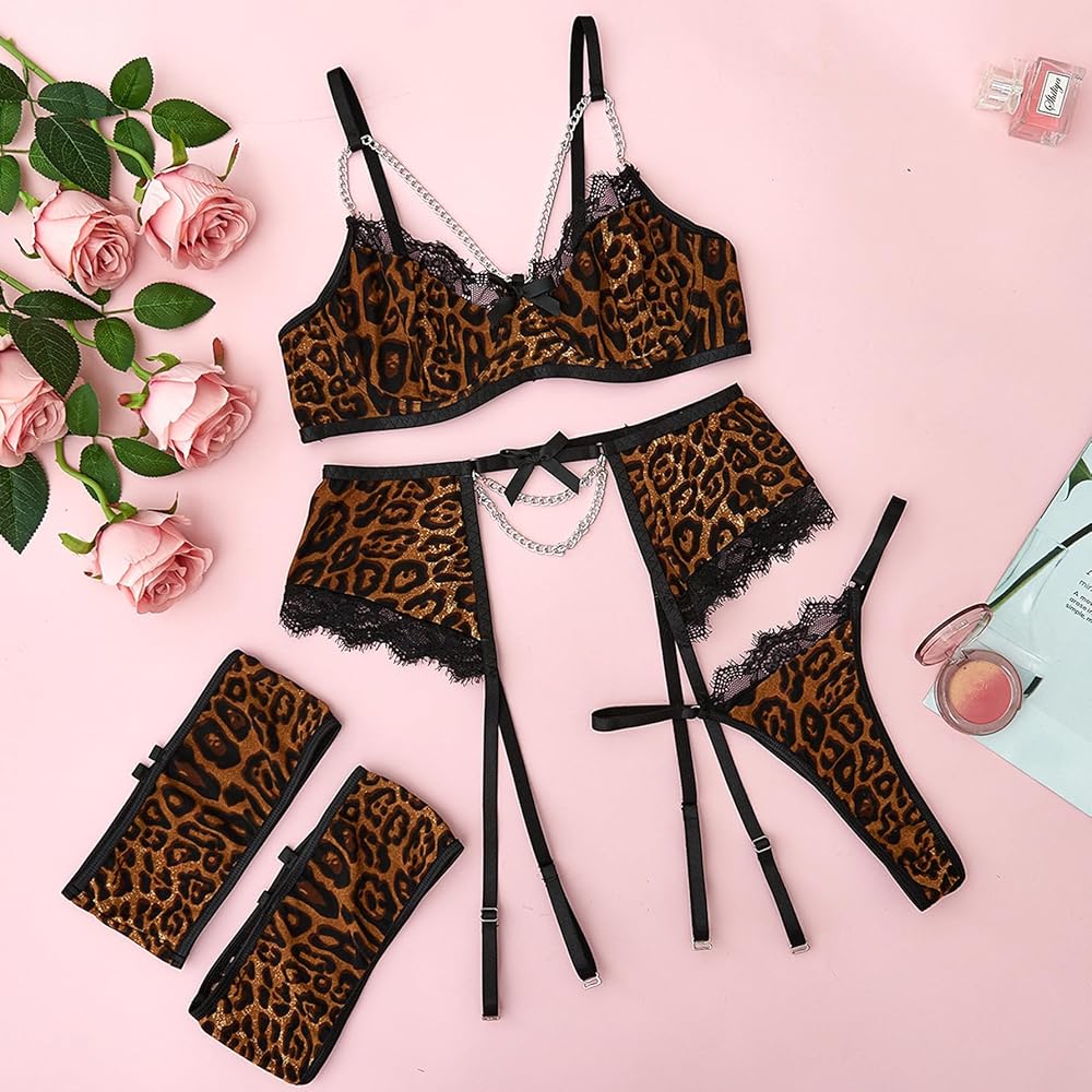 Womens chain lingerie set 4 pieces lace trim babydoll underwire bra and panty sets with garter belt