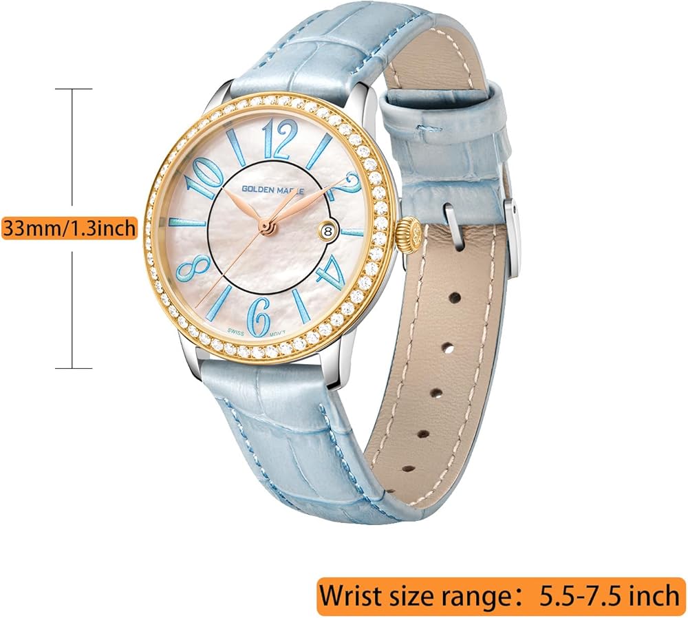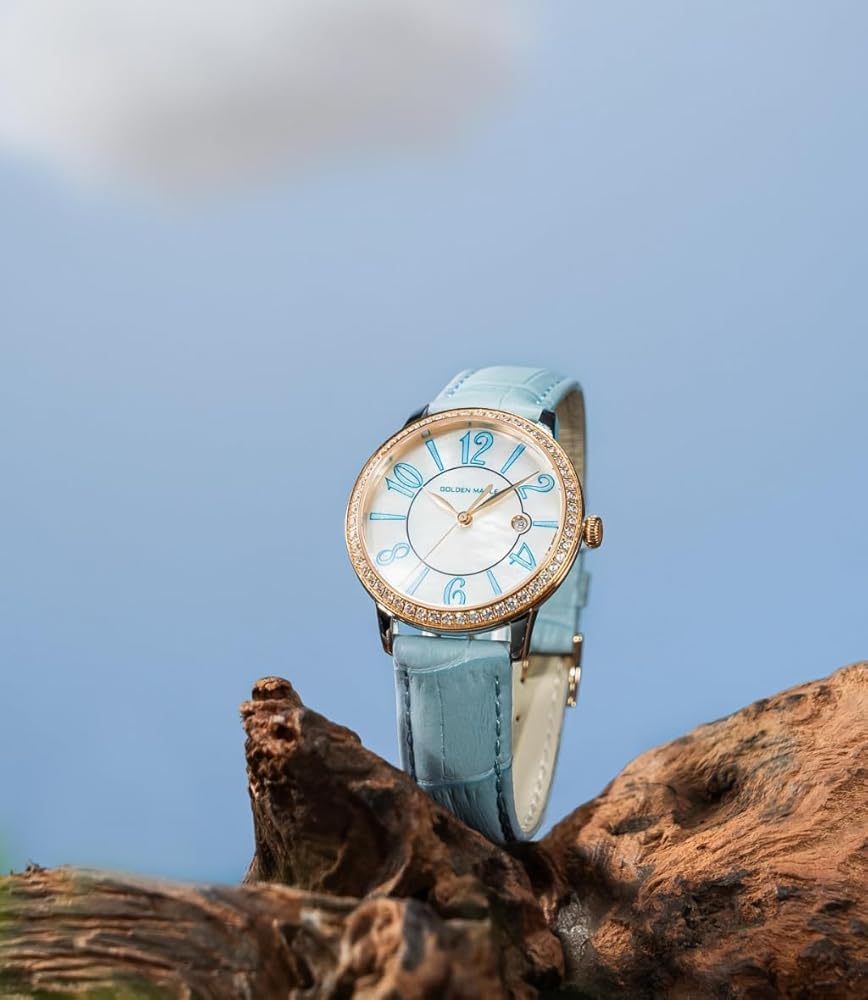 - تصميم أنيق: تتميز هذه الساعة الرائعة بمينا من عرق اللؤلؤ مزين بأرقام عربية زرقاء نابضة بالحياة وإطار من الماس المتلألئ