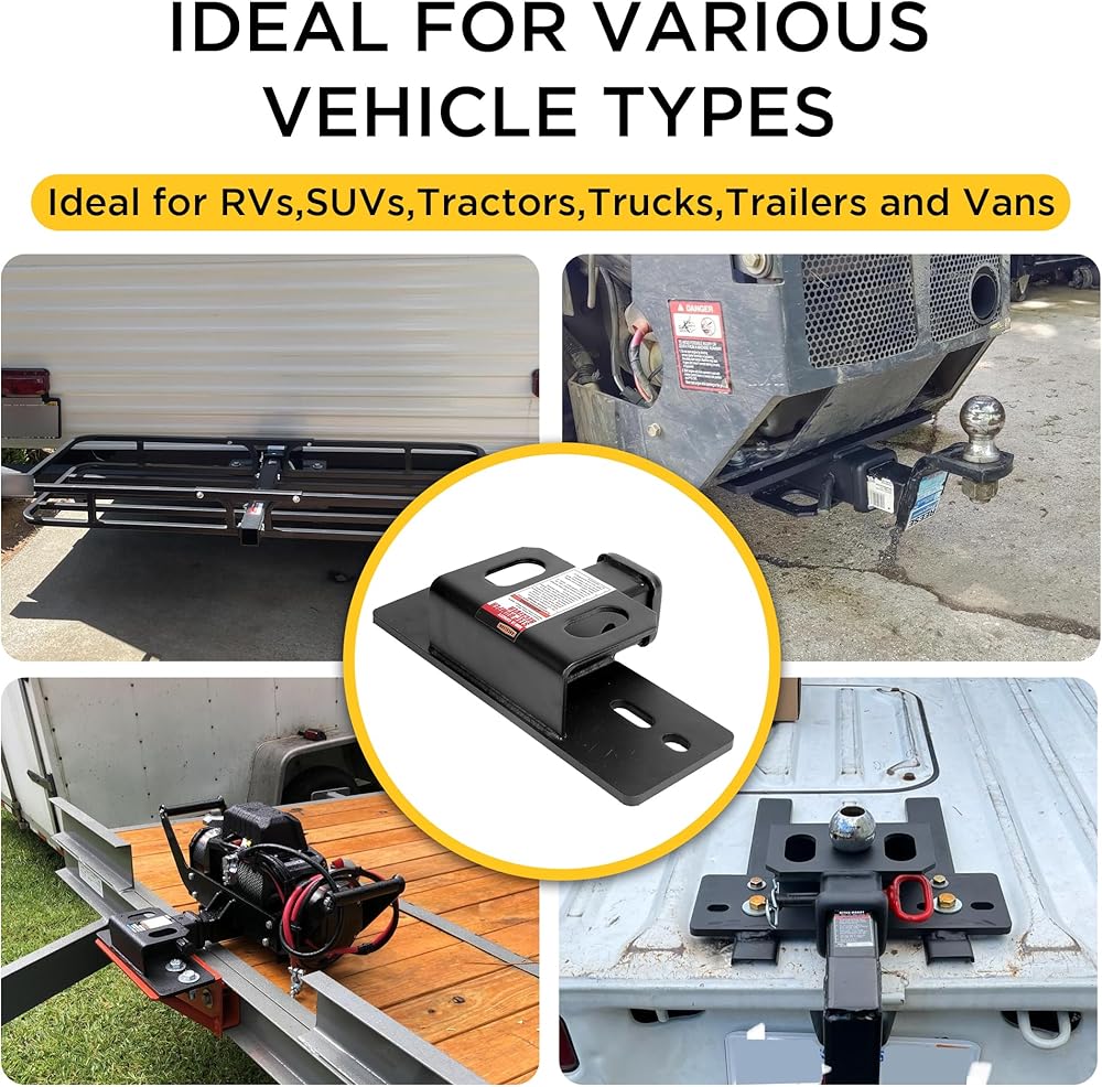 ملاءمة عالمية: متوافق مع مجموعة واسعة من المركبات، يوفر جهاز الاستقبال الممتص للصدمات هذا نقطة ربط آمنة، مثالية للشاحنات وسيارات الدفع الرباعي والشاحنات الصغيرة.