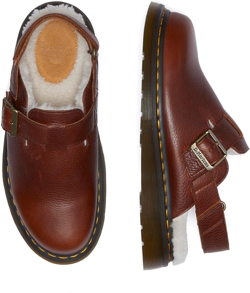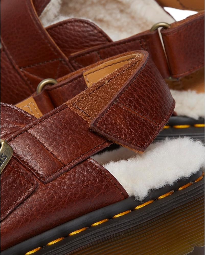 A borg fleece lining takes Dr. Martens smash-hit Jorge II silhouette into the colder months. Part shoe, part sandal, this wear-anywhere mule is as easy to slip on as it is to style. Built from rugged Ambassador leather, the Jorge II FL shoe is fitted with two adjustable straps to secure the fit and set on a classic DMS outsole punched with signature yellow stitching