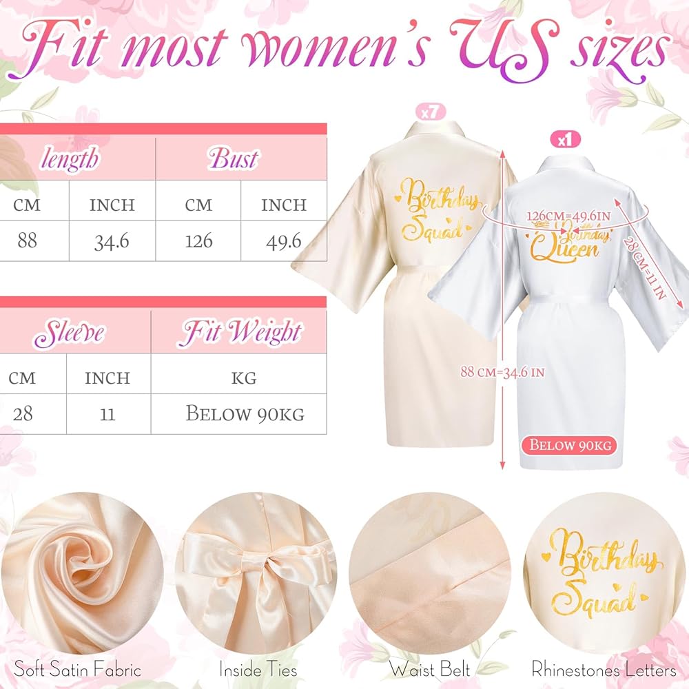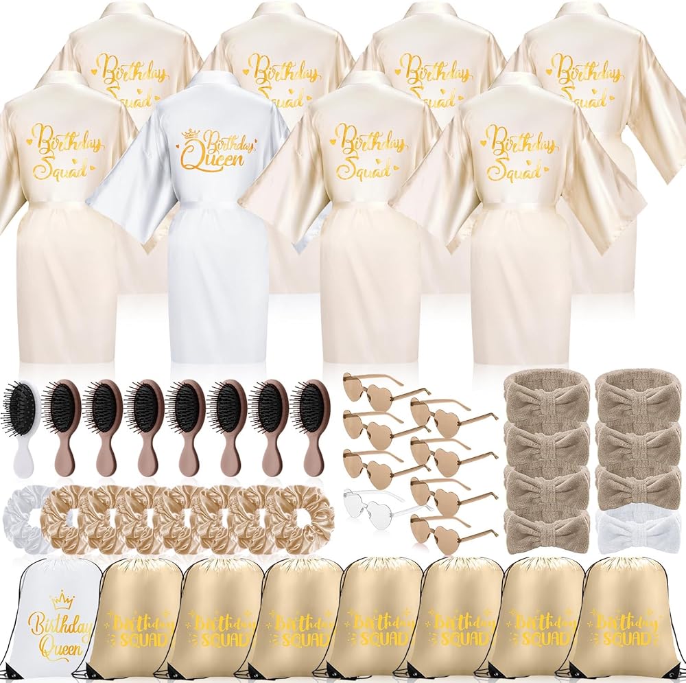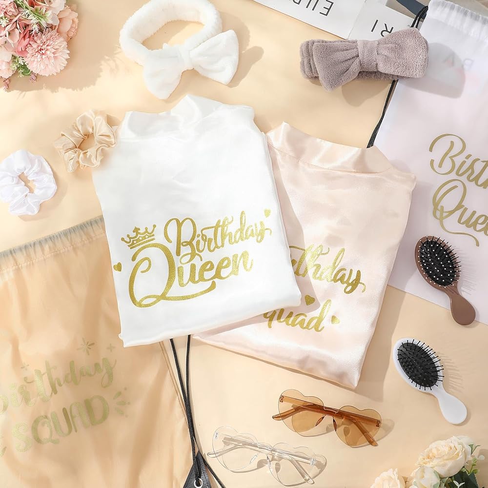 • مجموعة رائعة لحفلات أعياد الميلاد: ازدهري في احتفال عيد ميلادك الكبير مع مجموعة أرواب عيد الميلاد الرائعة هذه والتي تتضمن 8 أرواب لحفلات أعياد الميلاد، و8 ربطات شعر من الساتان، و8 أمشاط شعر محمولة، و8 ربطات شعر قطيفة، و8 أزواج من النظارات الشمسية على شكل قلب، و8 أربطة سحب. أكياس الهدايا؛ الرداء ذو ​​المطبوعات [Birthday Squad] وحروف [Birthday Queen] هو رداء عيد ميلاد لطيف للنساء اللاتي يهدفن إلى الإدلاء ببيان.
