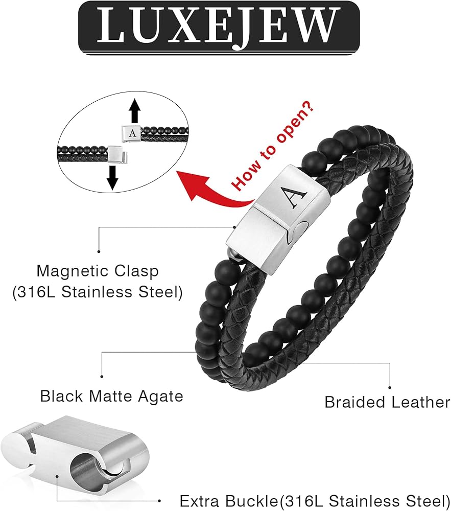 المادة: مصنوعة من خرز العقيق غير اللامع مقاس 6 مم + جلد مجدول 6 مم + مشبك مغناطيسي من الفولاذ المقاوم للصدأ مكون من 26 حرفًا. سوار مطرز من الجلد الأسود للرجال يستخدم الجلد المضفر الأصلي المصنوع يدويًا وأحجار العقيق الطبيعية غير اللامعة مقاس 6 مم.