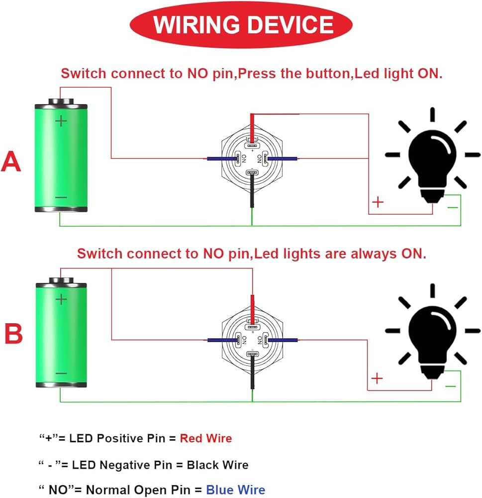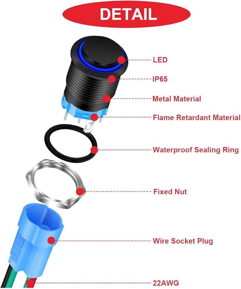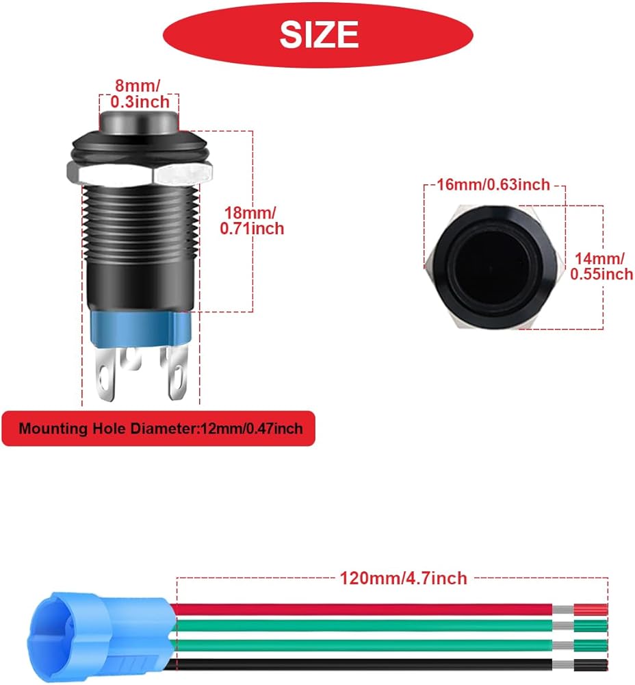 SPECIFICATIONS:Rated Voltage And Current:12V DC 2A;Positions: 2 (ON / OFF);Pin Quantity: 4;Contact Type: SPST;Protection Degree: IP65;Mounting Type:Panel Mount;Mounting Hole Diameter: 12mm /0.47inch;Wire Length: 120mm / 4.7inch;LED Color: Red/Yellow/Blue/Green.