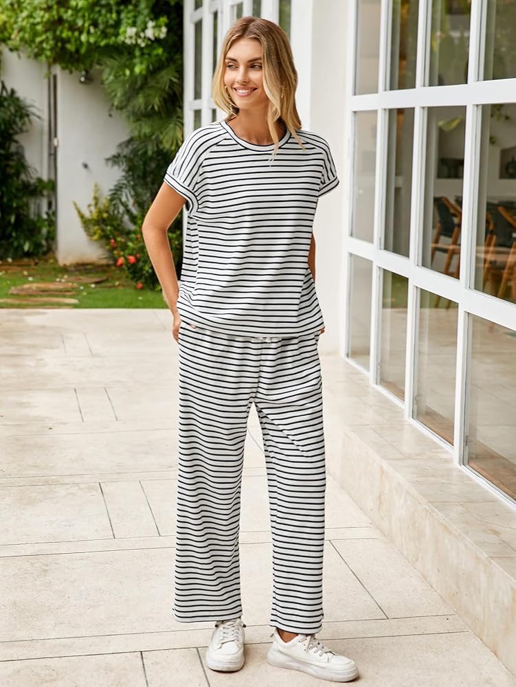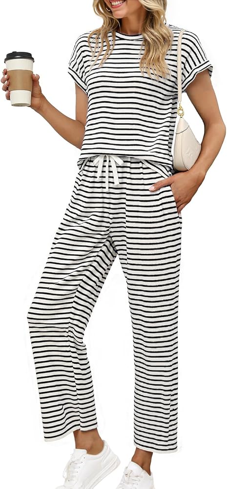 مجموعة نسائية مكونة من قطعتين - هذه السراويل مجموعات ملابس نسائية مكونة من قطعتين تتضمن بلوفر برقبة دائرية وأكمام قصيرة وسروال طويل بأرجل واسعة مع خصر مطاطي برباط لملاءمة قابلة للتعديل. سواء كنت تسترخي في المنزل أو أثناء التنقل، فإن هذه المجموعات المطابقة من الملابس النسائية توفر لك الأناقة والعملية
