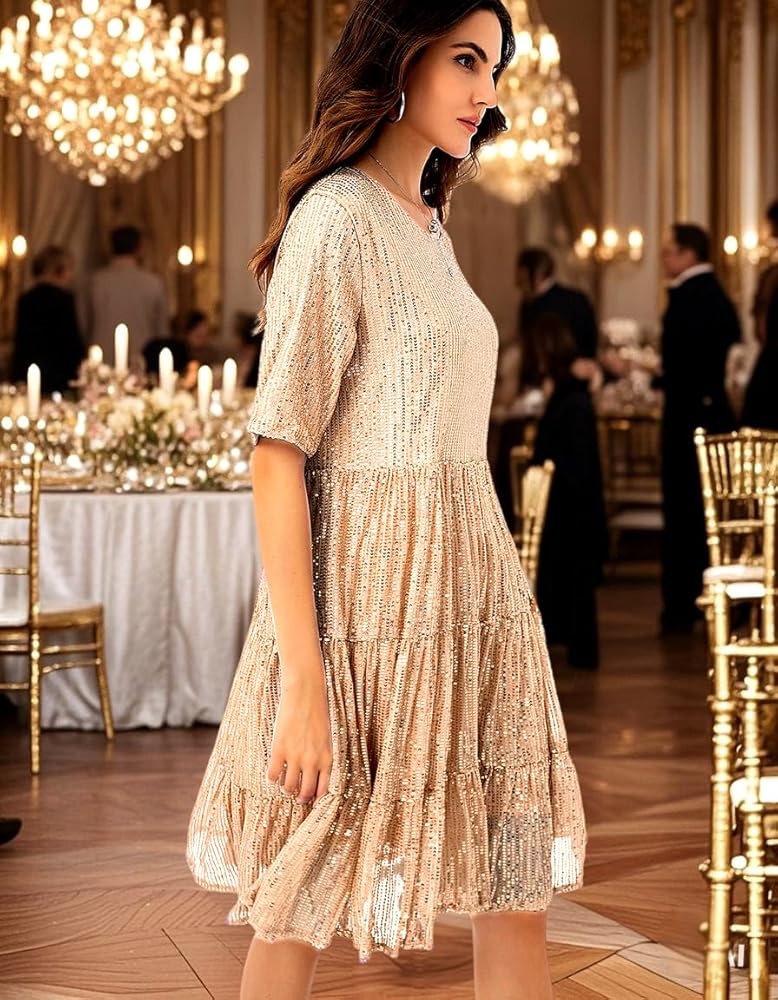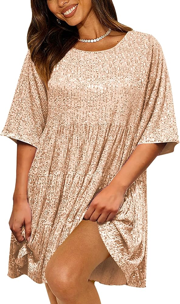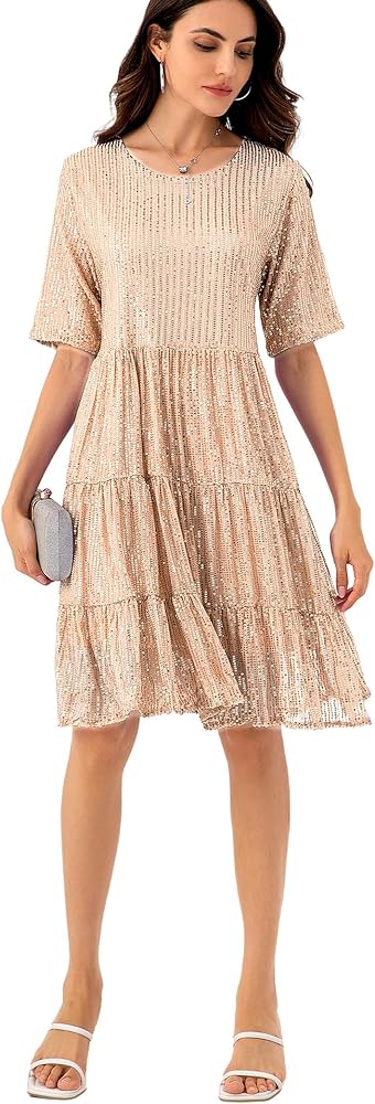 Sequin Babydoll Summer Dress,Sparkly Glitter Dress Short Flowy Tiered Tunic Dress for Women Party Club Night