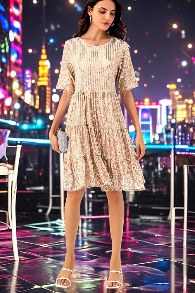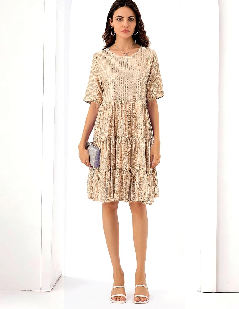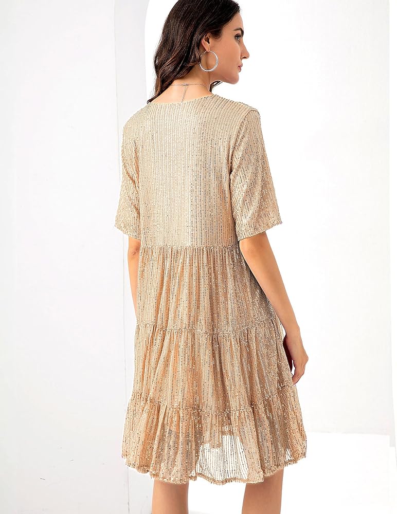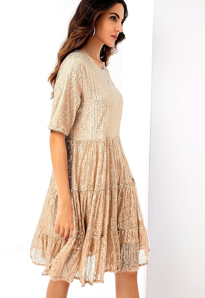 • Feature: Sequin short flowy dress loose fitting, crew neck, half sleeve, shiny sparkly, A Line, casual, cute and trendy design, sweet flowy ruffled hem flatter your curves and hide your tummy, the sequin mini dress make you the center of attention in the crowd.