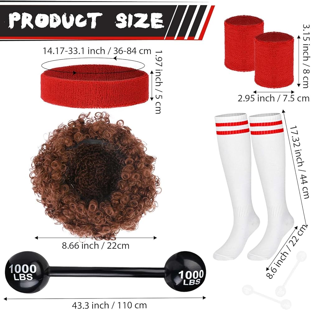 One Size Fits Most: The afro wig cap is elastic and suitable for most head shapes; the sweat headband measures about 10cm, the wristband measures about 10cm, and the length of the socks is about 10cm. They all have excellent elasticity and can perfectly fit most sizes. The inflatable dumbbell toy is approximately 110cm long when fully inflated.