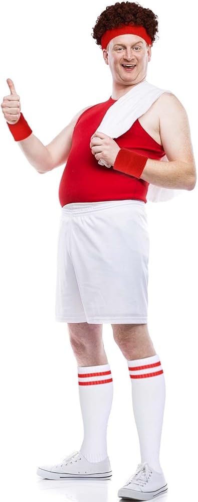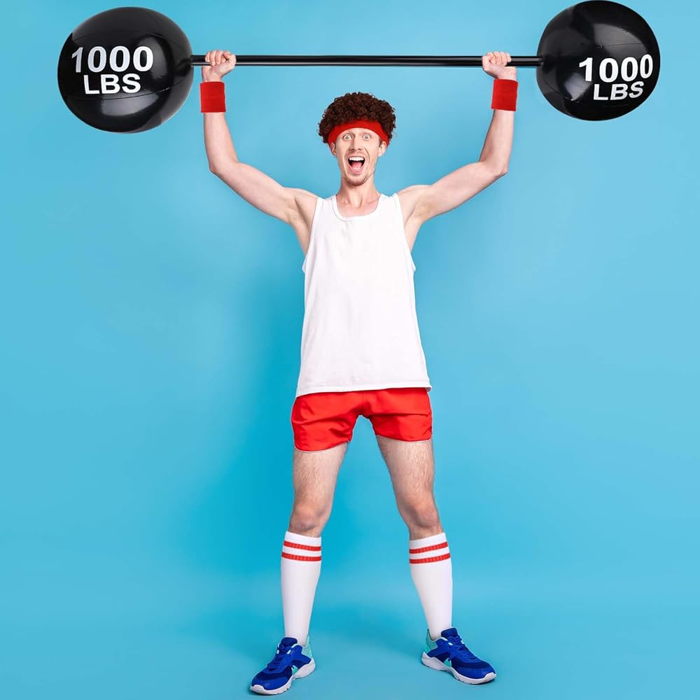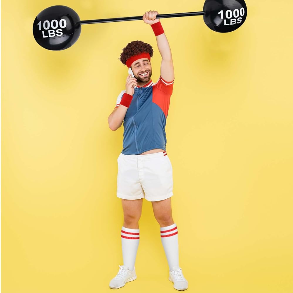 Product Include: This 80s men workout accessories set includes 1 afro wig, 1 sweat headband, 1 pair of wristband, 1 pair of socks and 1 inflatable dumbbell with a pump. This complete set of fitness clothing can meet your daily needs and role-playing requirements.