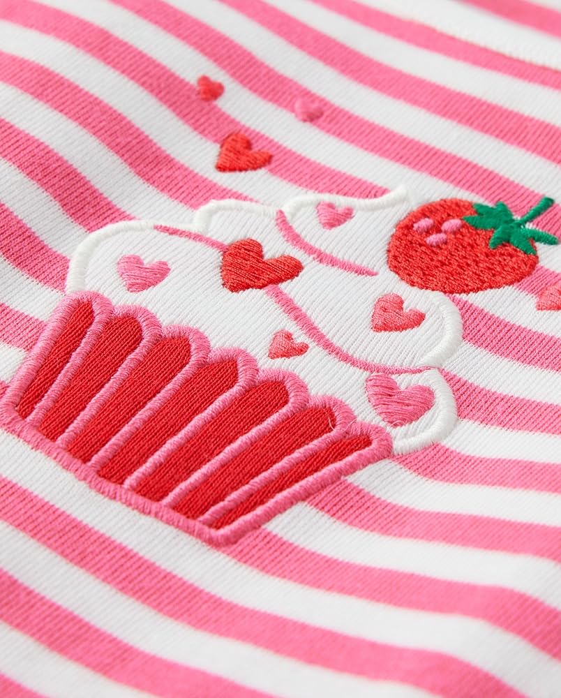 FEATURES: Striped bodice, chocolate covered strawberry and dessert print skirt, ruffle waist with bow