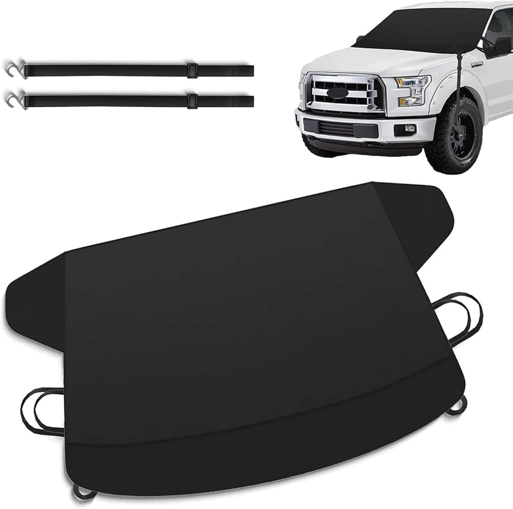 قطعة واحدة من غطاء الزجاج الأمامي للسيارة من أكسفورد السميك للسيارة، غطاء ثلجي مقاوم للماء في جميع الأحوال الجوية، سيارة مقاس 66.92 بوصة × 42.12 بوصة مع واقي مرآة جانبية، عالمي لمعظم السيارات (أسود)