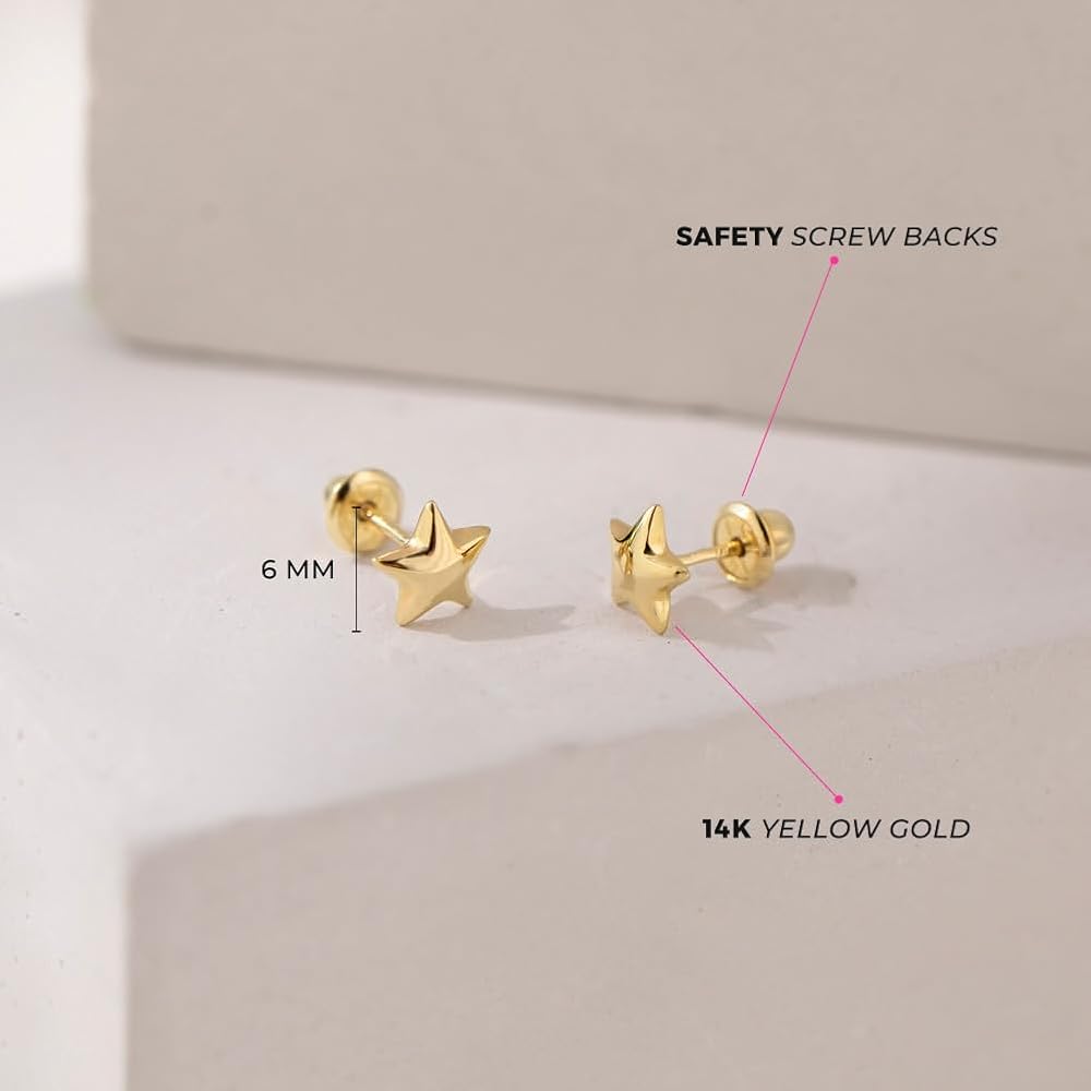 أقراط من الذهب الأصفر عيار 14 قيراط على شكل نجمة منتفخة للأطفال الصغار والفتيات الصغيرات - أقراط فتاة صغيرة على شكل نجمة - أقراط فتاة برغي أمان مصقولة من الخلف للفتيات الصغيرات