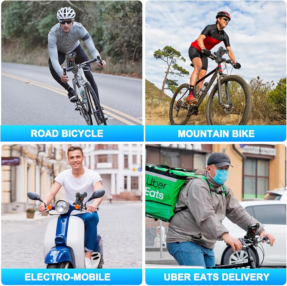 💪【 قوي وآمن】 التصميم الخاص لحامل هاتف الدراجة هذا يمسك كل ركن من أركان هاتفك بإحكام. يضمن زر الأمان أيضًا توصيل هاتفك الخلوي بمقود الدراجة حتى على الطريق الوعر.