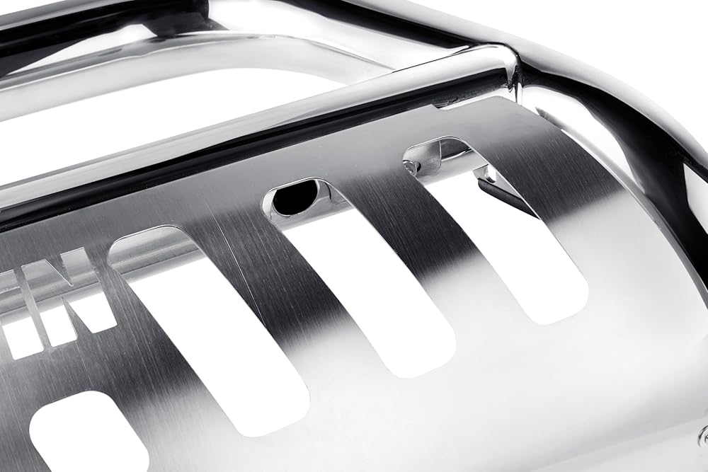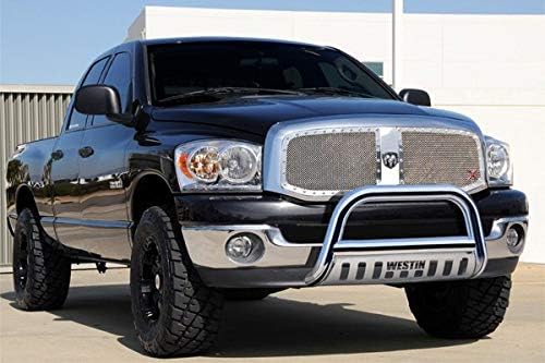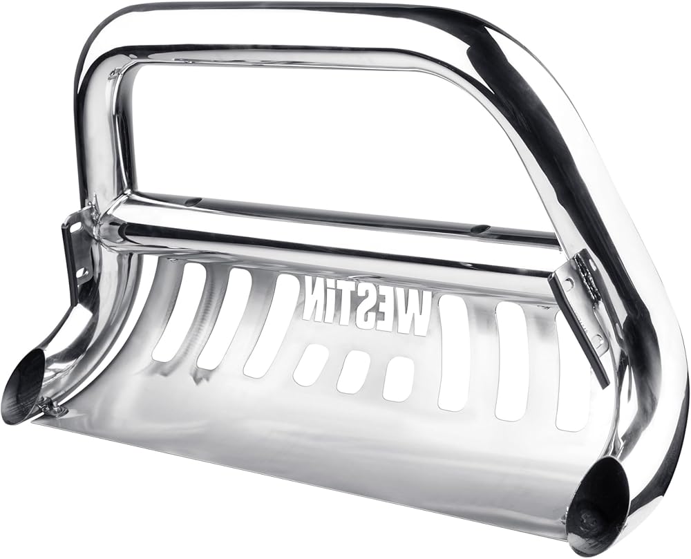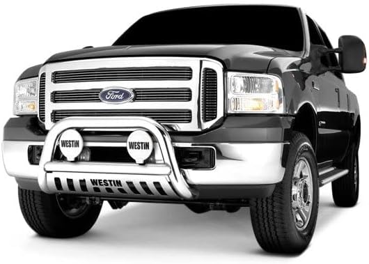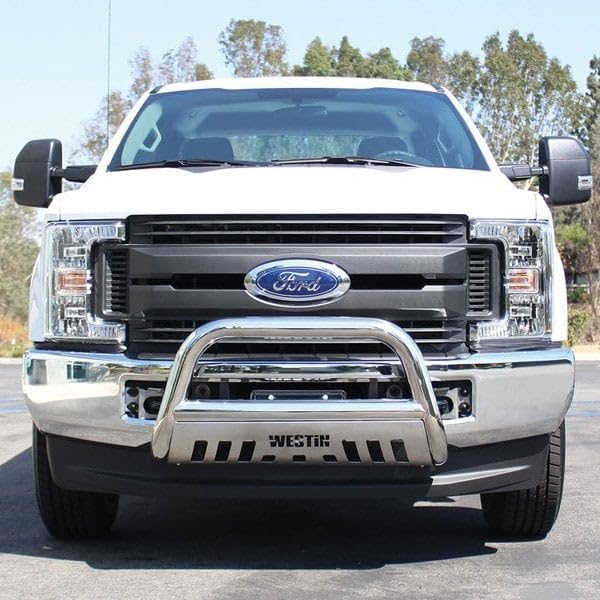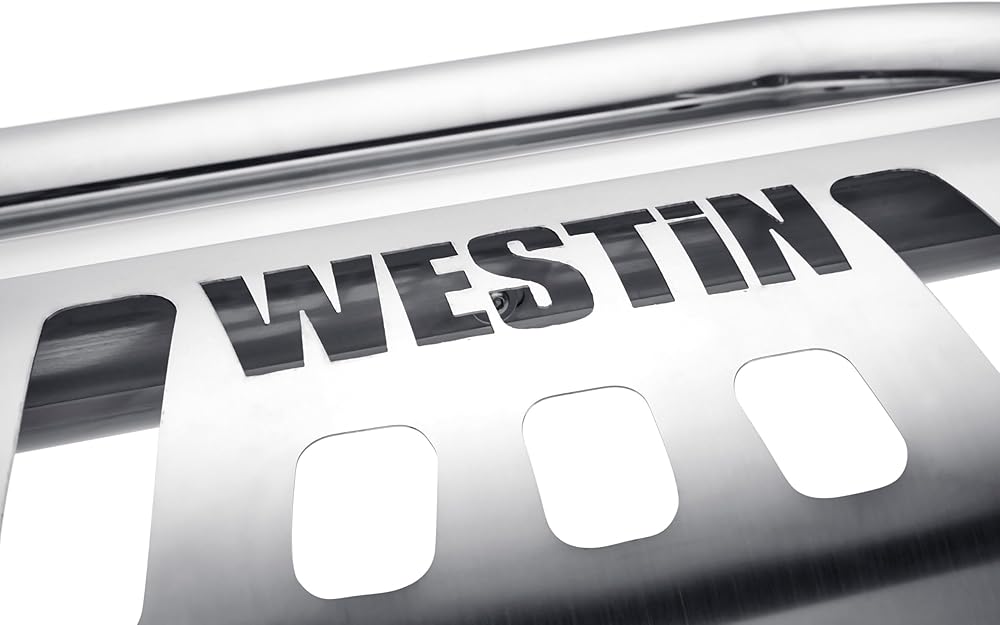 Westins E-Series Bull Bar is a front-end light bar designed for trucks and larger model SUVs. It mounts to the vehicles existing mounting points with no drilling required and comes complete with vehicle specific mount kit. It also features mounting points for 2 auxiliary lights up to 6 inches in diameter. The E-Series Bull Bar features a laser cut Westin block letter logo design on the skid plate. Available in black powder coated e-coated steel with a textured black skid plate backed by a 3 year warranty. Optional license plate bracket is available.