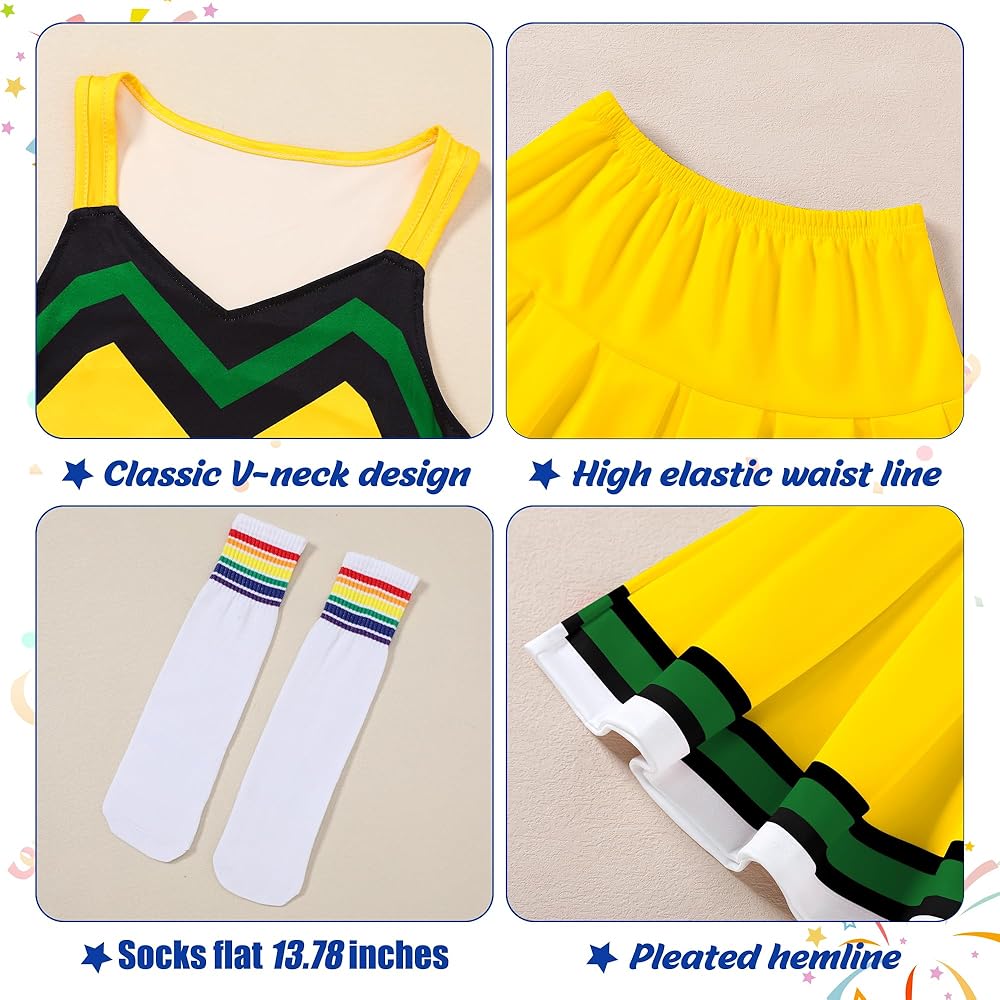 Unique Design: Lettering logo, sleeveless, pleated skirt design along with bright colors make the cheerleading dress look more special and vibrant.Make your child more vivid and cute. Cheerleading Pom Poms, adding dynamism: The included cheerleading pom poms are beautifully designed, adding dynamism and charm to performances, making girls stand out even more during shows.