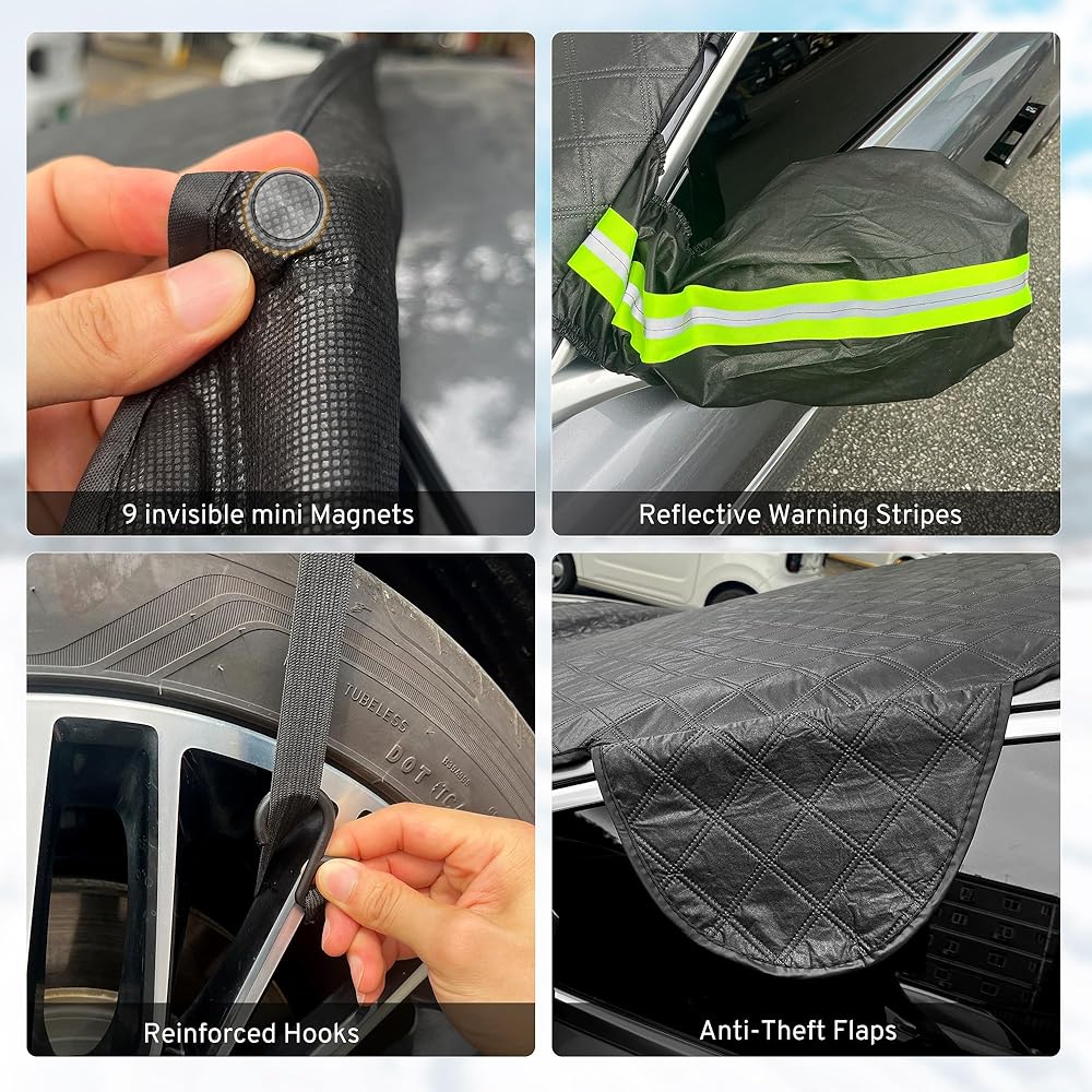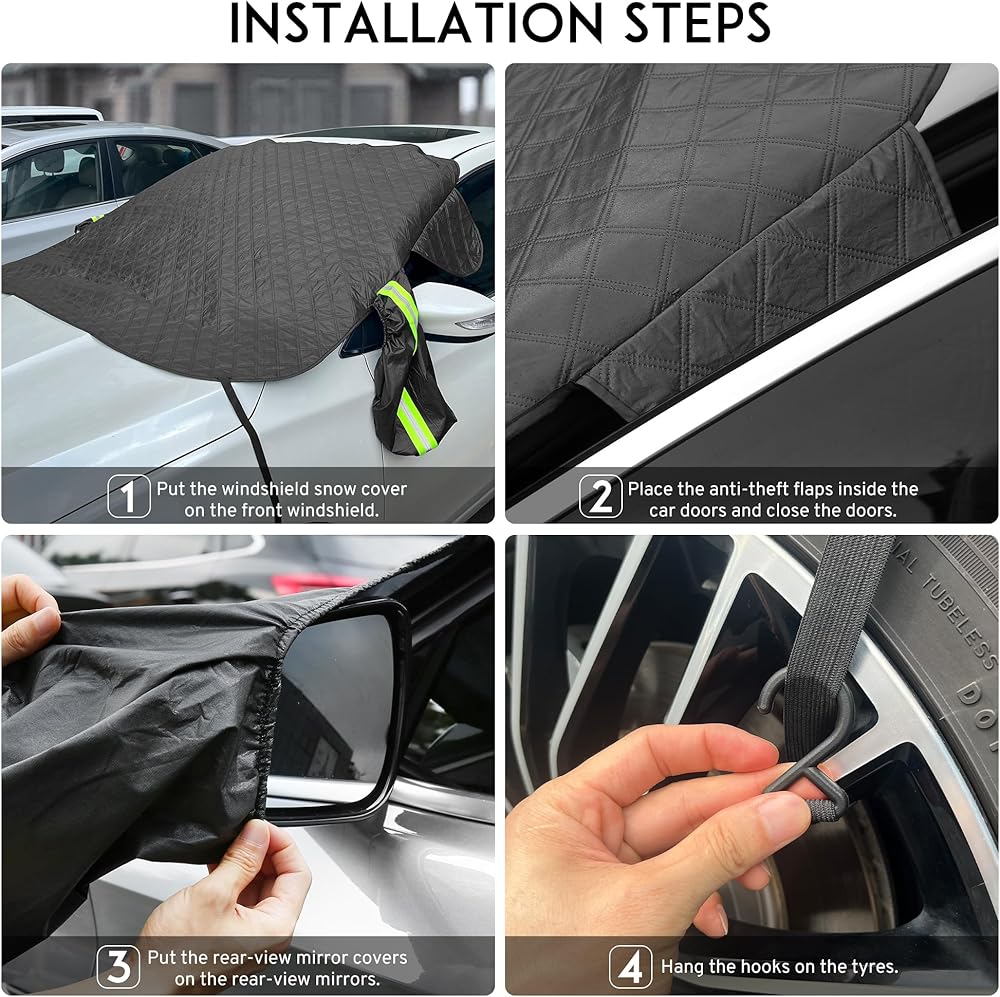 【تصميم مقاوم للرياح ومضاد للسرقة】: غطاء ثلجي للزجاج الأمامي للسيارة مع ألسنة مضادة للسرقة وأكمام مرآة رؤية خلفية مرنة لن تتمزق أو تنفك، خاصة في أيام الرياح الشرسة. اللوحات ذات البابين لها تأثير مقاوم للرياح ومضاد للسرقة؛ تم تجهيز أكمام مرآة الرؤية الخلفية بشرائط تحذيرية للانعكاس الليلي، مع تحذيرات عاكسة، وتحسين الرؤية الليلية لمنع خدشها بواسطة المركبات الأخرى في الليل.