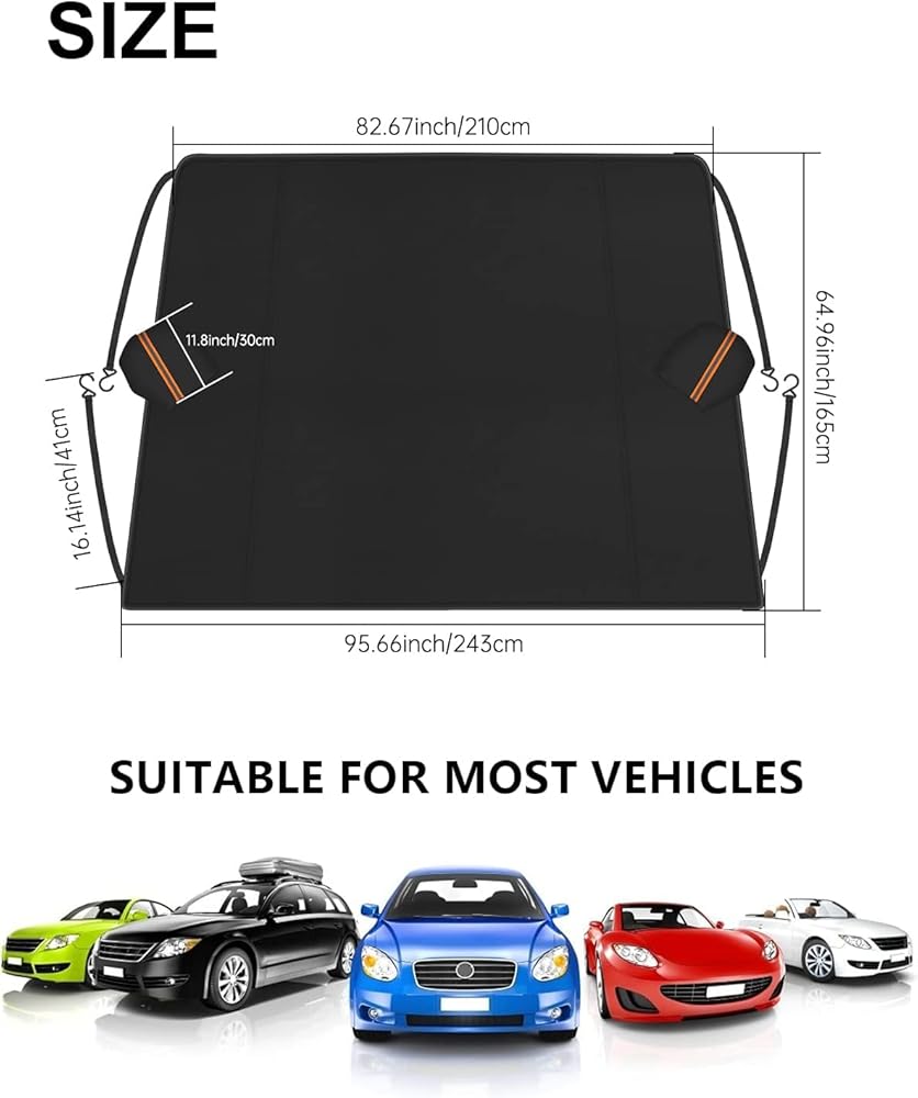 【MUlTIPLE USES & EASY TO INSTALL】This amazing windshield cover protects your car from the harsh effect of weather elements. It also protects your car from the effects of guano and deciduousness. This windshield cover can be installed in a few minutes and it is equipped with a special storage bag so it can be placed in the trunk or cab after use.