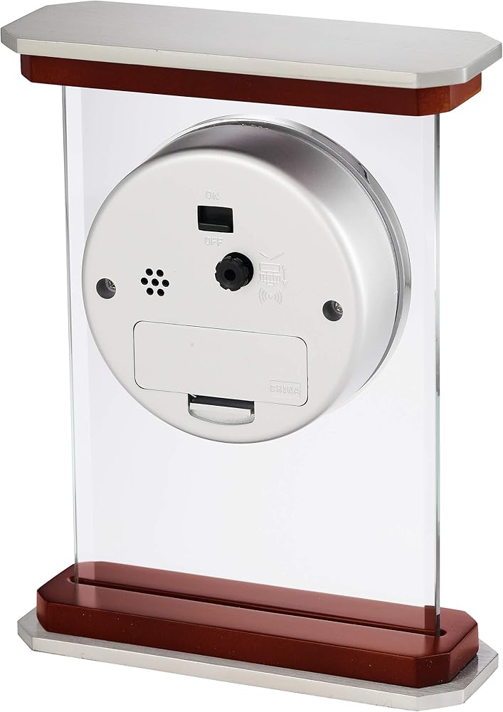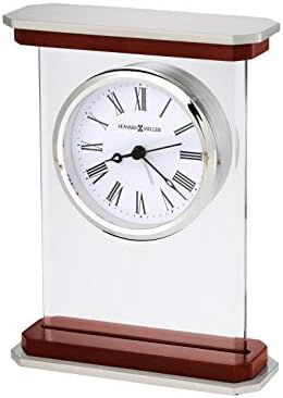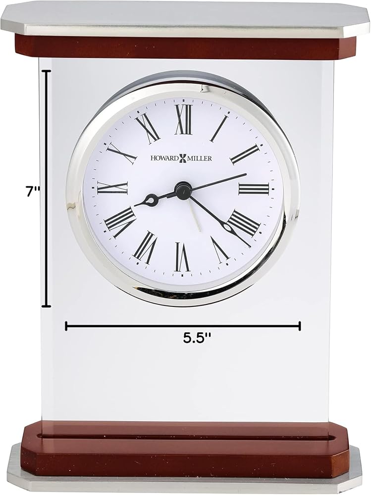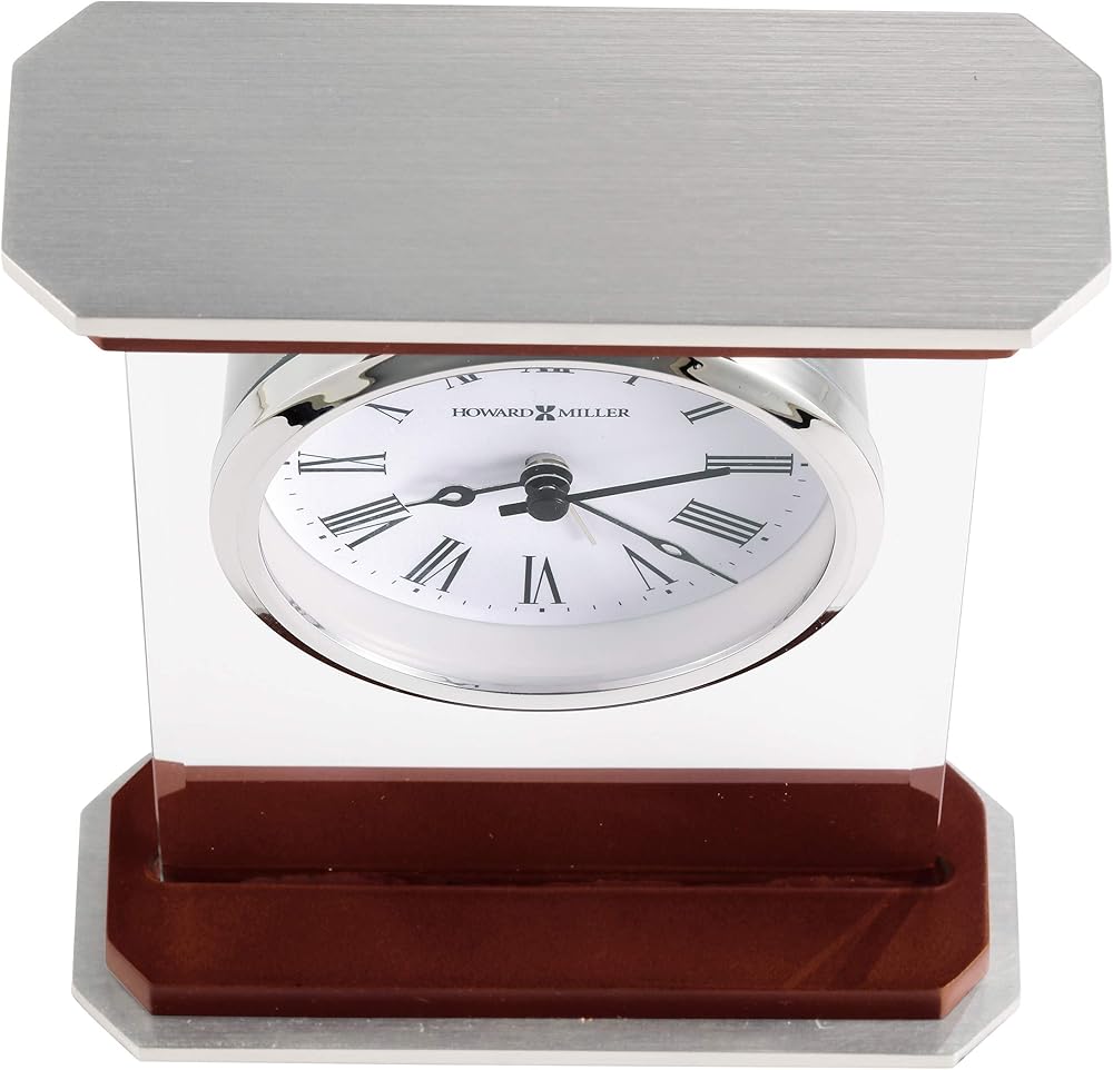 Featuring the Howard Miller Mayfield tabletop clock, famous for its unique clock design and a combination of satin rosewood and silver polished aluminum. This premium table clock combines timeless elegance with modern functionality, making it a perfect addition to any space. The frame, crafted from durable metal and covered in clear break-resistant crystal glass, exudes sophistication, with its bold base and top finished in satin rosewood and highlighted by brushed aluminum accents. The felt-covered bottom ensures that your desk or mantel stays scratch-free, offering both style and practicality. At its heart, the modern clock is engineered with a precision quartz movement, ensuring flawless timekeeping. The nearly silent operation, thanks to its specially designed escapement mechanism, creates a peaceful atmosphere without the distraction of constant ticking. The mini clocks black hour and minute hands glide smoothly over a crisp white dial, enhancing both readability and ambiance. The frame's blend of rosewood and polished metal lends a classic touch, while the bold black numerals stand out against the white background for effortless viewing. This analog clock also features a practical and easy-to-use alarm system. Simply pull the knob at the back, set your desired time, and push it back in place. The advanced micro-engineering ensures precise control over the alarm settings. Compact yet striking, with dimensions of 5.25” wide, 2"" deep, and 7” tall, this automatic clock is perfect for a mantelpiece, office desk, or bedside table, adding a touch of elegance to any setting. Founded in 1926 by Howard C. Miller in Zeeland, Michigan, the company is renowned for its commitment to quality and craftsmanship. Once the "World's Largest Grandfather Clock Manufacturer," Howard Miller offers a wide range of products, from portable clocks to collectors cabinets, all with the same attention to detail.
