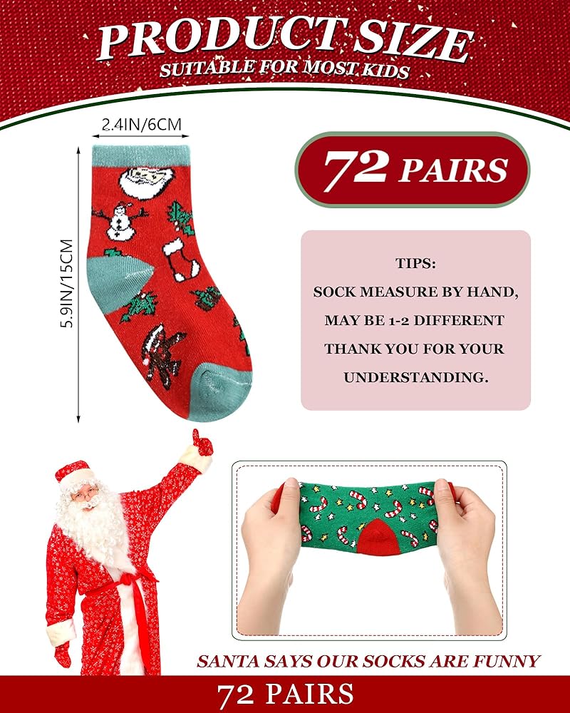 Rich in Quantity: the package includes 72 pieces of kids Christmas socks, the sufficient quantity can meet your Christmas gifting needs, making the happiness and joy to your kids to celebrate the Christmas