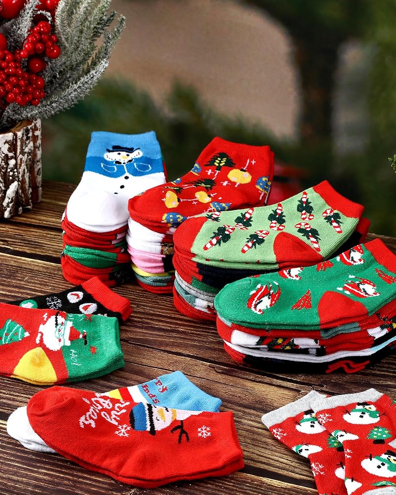 Vibrant Christmas Themed Printed: the holiday socks for kids are designed with various Christmas themed patterns, such as Santa Claus, Christmas trees, gift boxes, snowmen, reindeer, and many more festive designs, these socks are bound to boost your child's festive mood