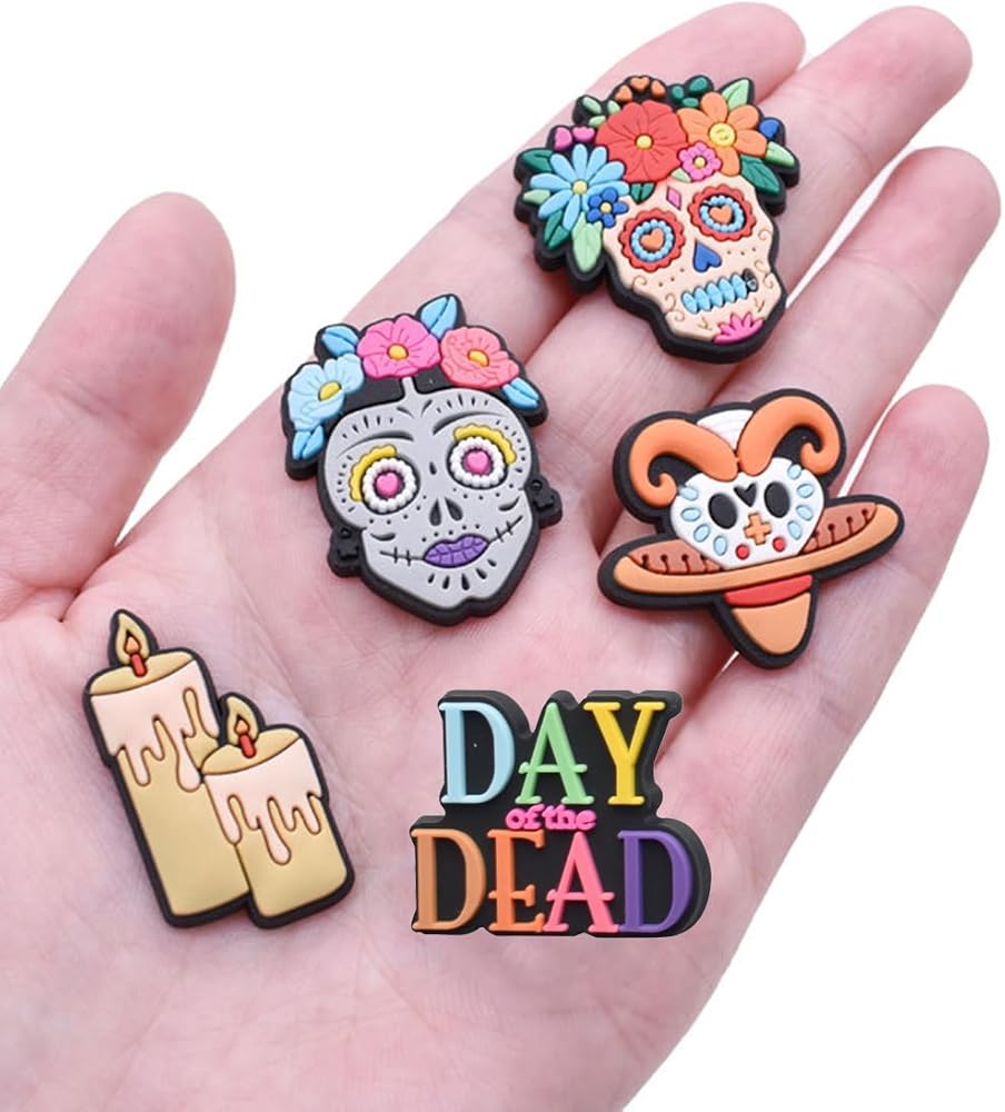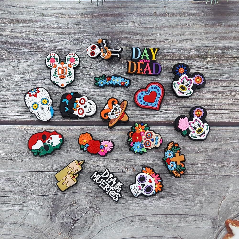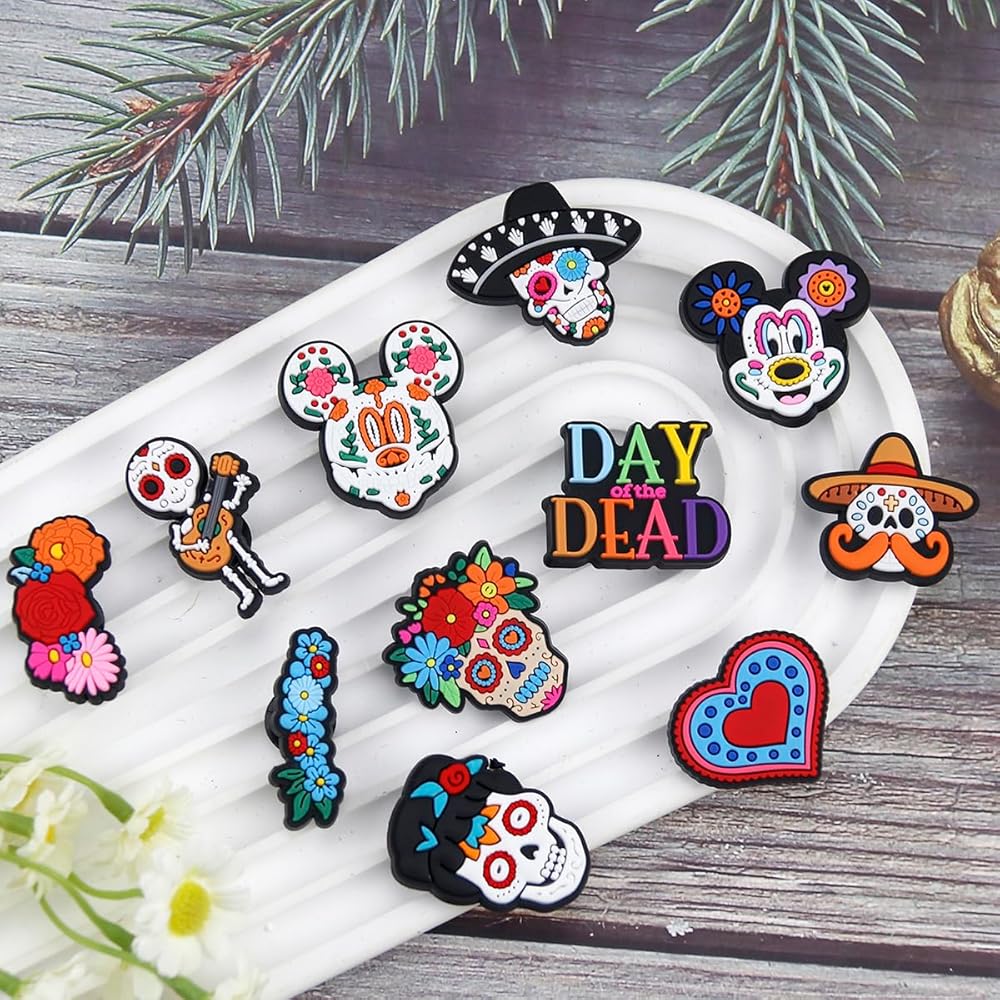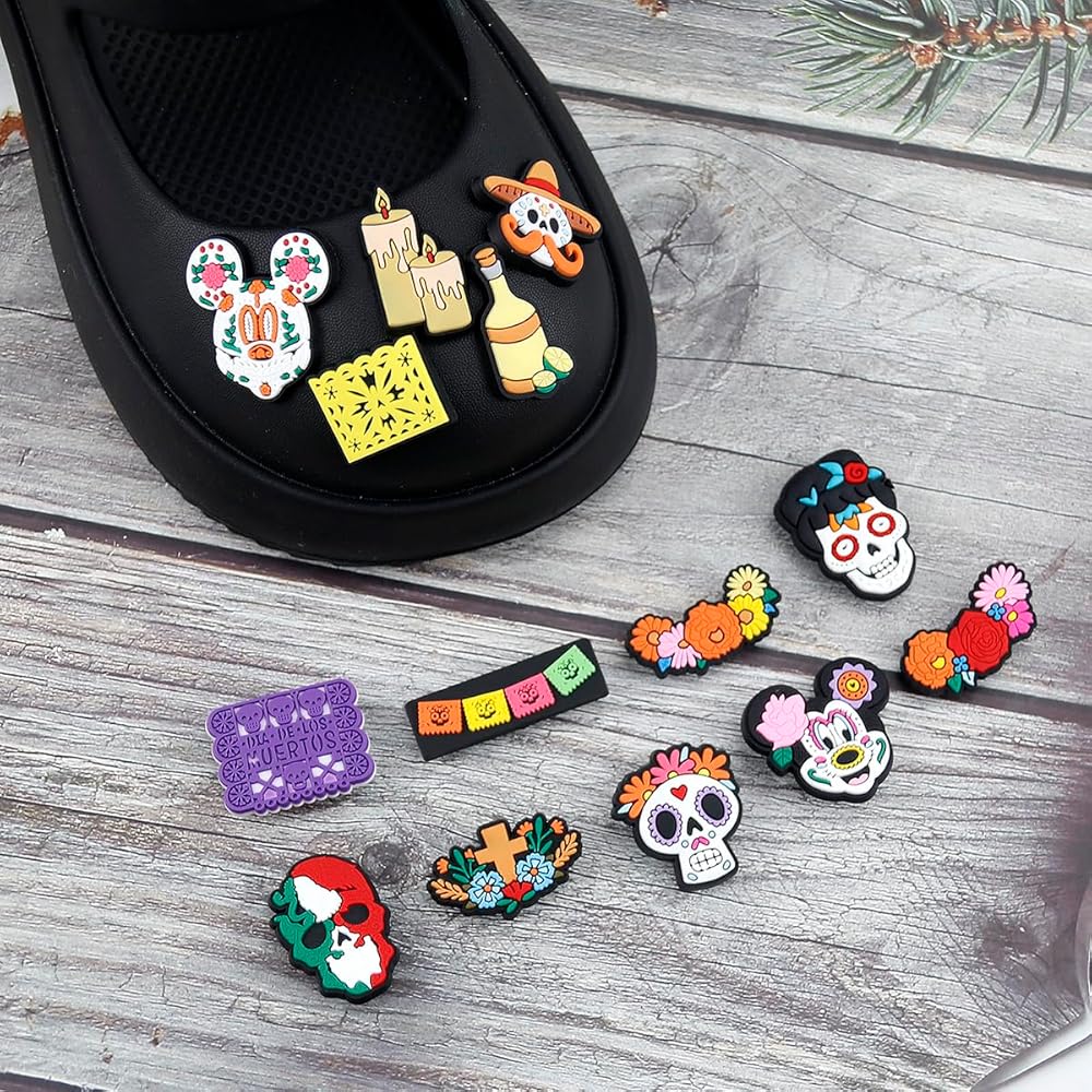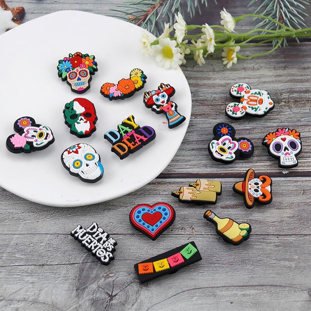 WOLWES يوم الموتى سحر الأحذية للنساء الرجال الكلاسيكية تصميم الجمجمة زهرة لطيف سحر الأحذية لسد الصنادل معصمه أساور حزب الديكور الهدايا 30pcs