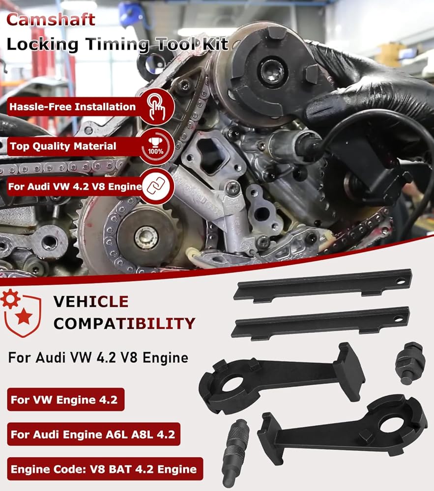 APPLICATION -- This locking timing tools suitable for VW Audi A6L A8L 4.2 liter V8 BAT engines. Fit for Audi A6 Quattro Q7 A8 Quattro S6 A6 S5 S8 A7 Quattro RS4.