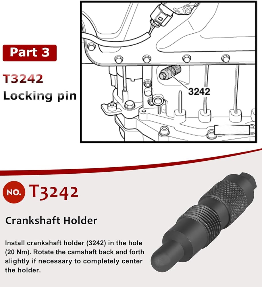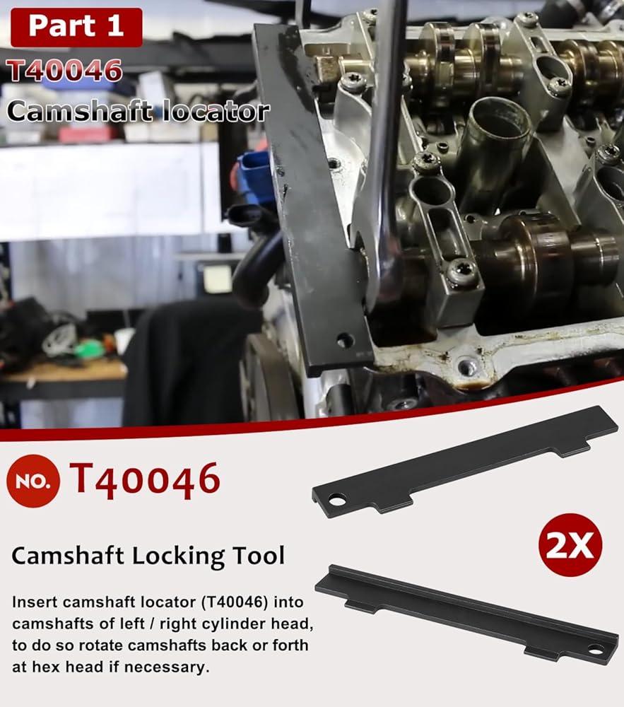 DIRECT REPLACEMENT -- OEM Number: T40046; T40047; T3242; T40058. This kit contains the camshaft and cam sensor locking tools required for the 4.2 V8 petrol engines found in the for Audi range from 2002 to 2009 with engine codes: BAS, BBK, BAT, BHF