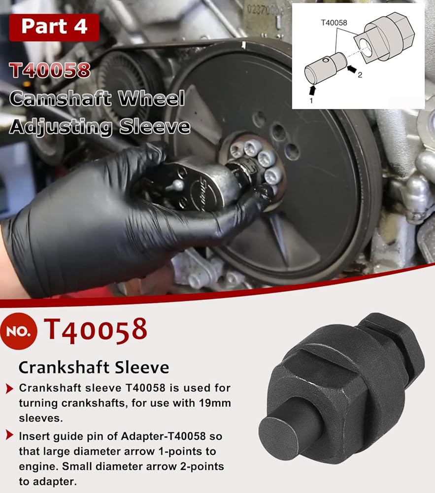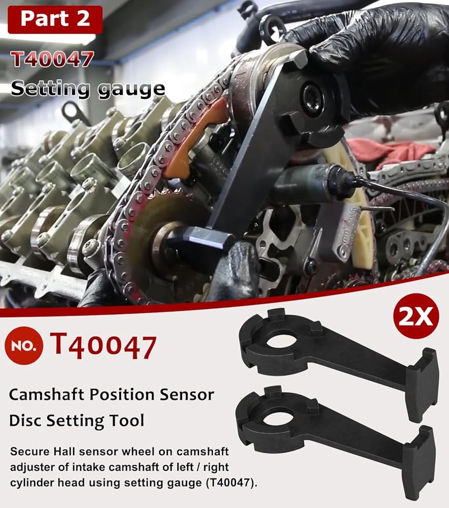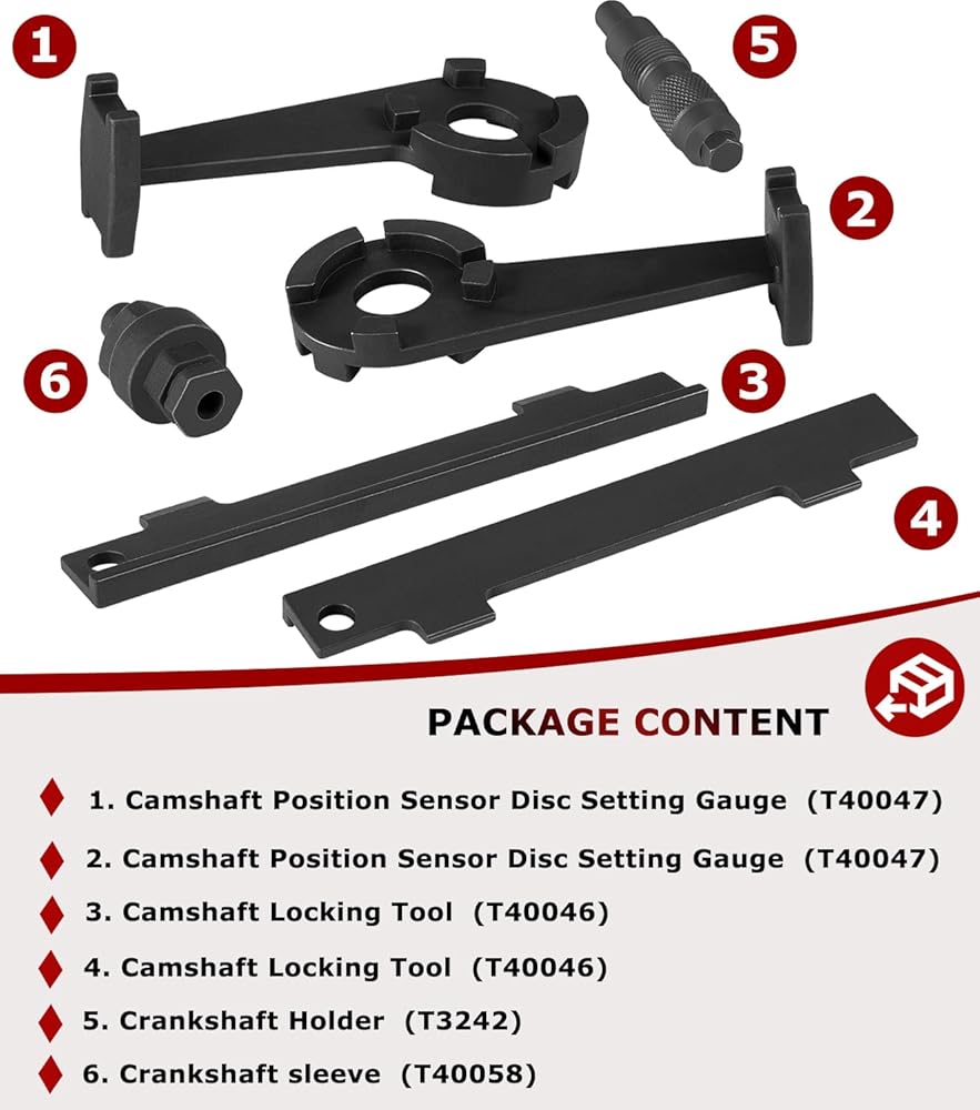 PACKAGE CONTENT -- Includes the following specialty tools needed for this job: 2 x Camshaft Fix Device 2 x Senor Fix Device, 1 x Camshaft Wheel Adjusting Sleeve, 1 x Fix Device